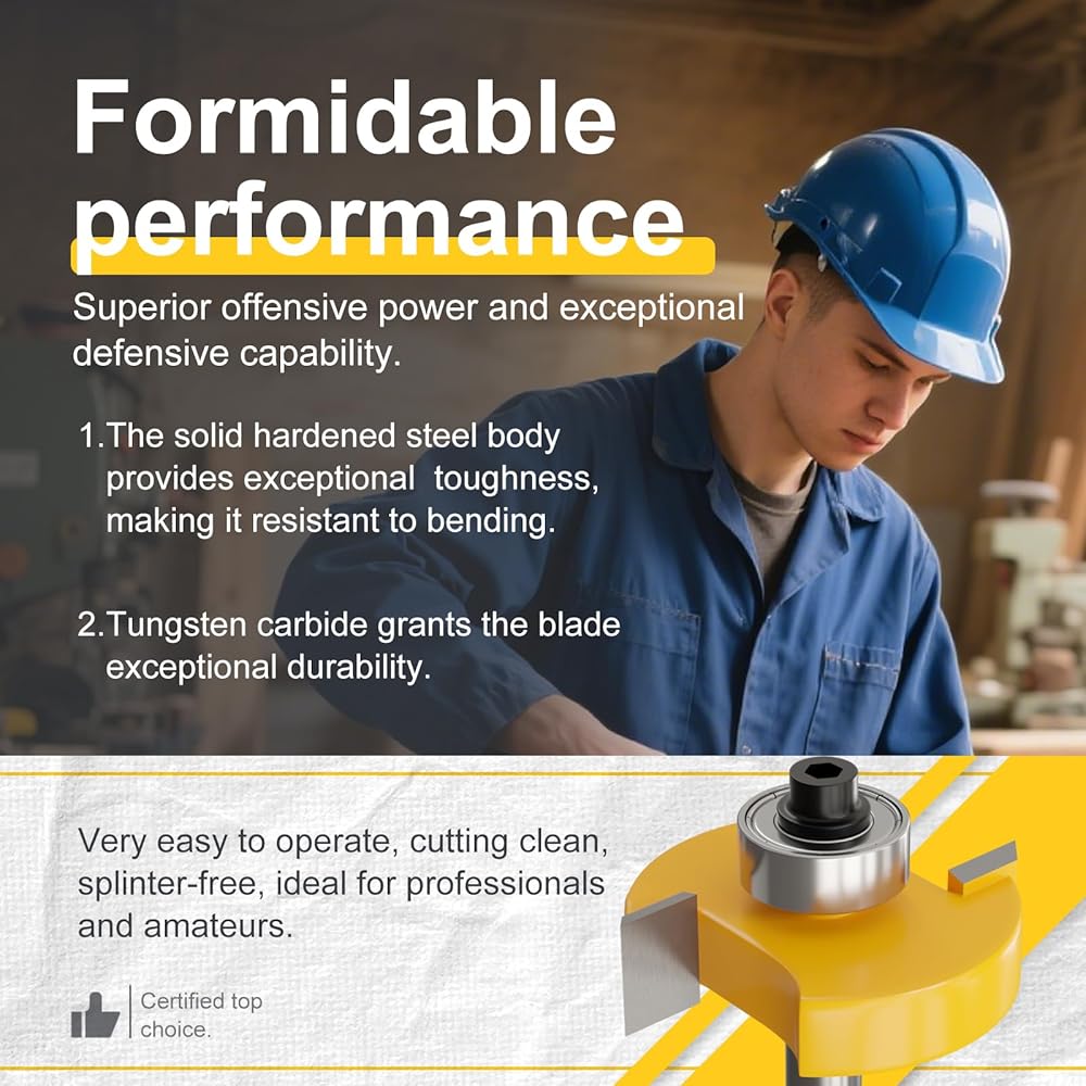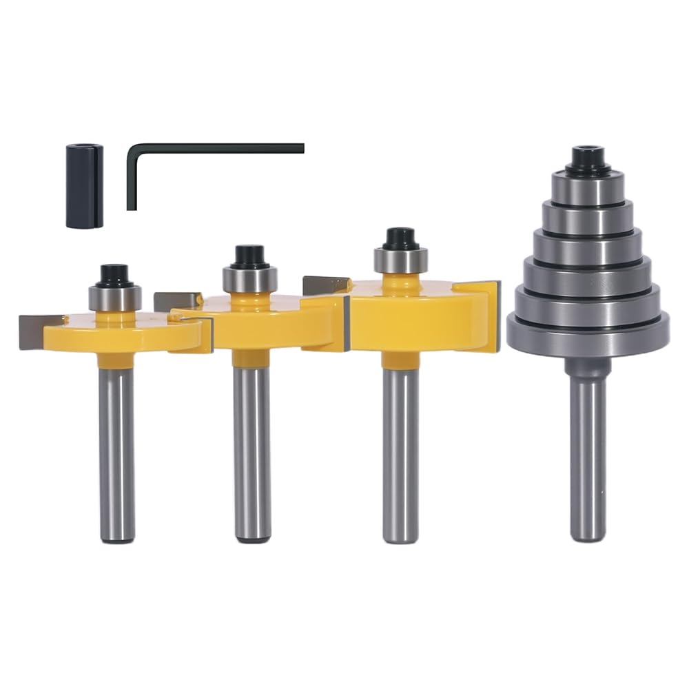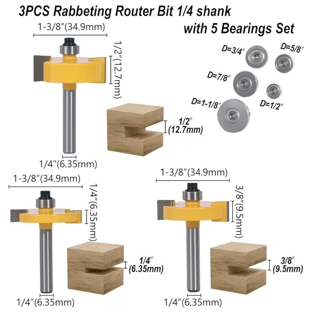 1/4 Inch Shank Rabbet Router Bit Set, 3 Pieces Carbide Tipped Rabbeting Router Bit with 6 Bearings Set, Interchangeable and Adjustable Bearing