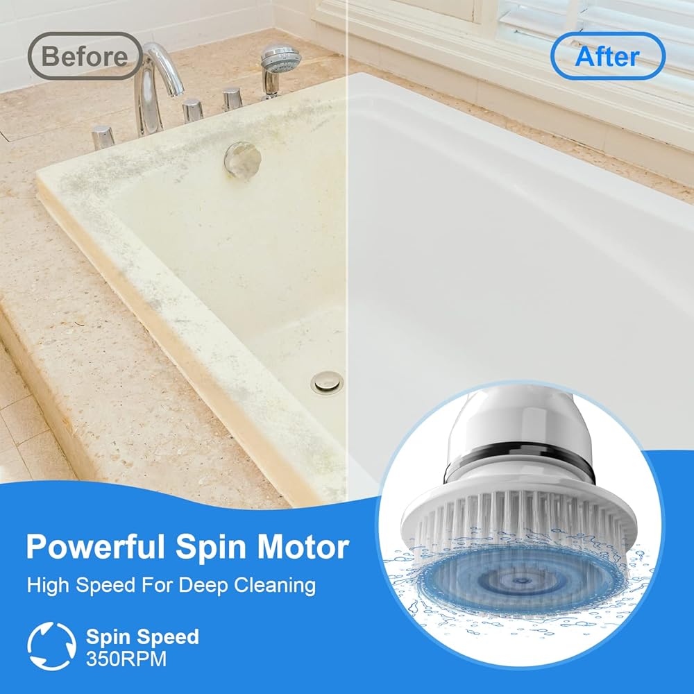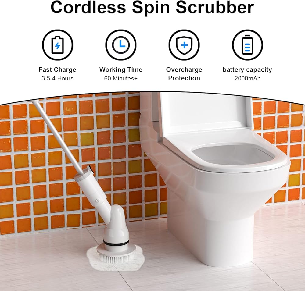 Cordless & Rechargeable Design - With no need for cumbersome wires, our bathroom spin scrubber is equipped with 2*2500mAh high-capacity rechargeable batteries. Once fully charged, it can work for 60-90 minutes, enough for you to do a deep cleaning job effortlessly, and is a good helper to avoid frequent joint strain.
