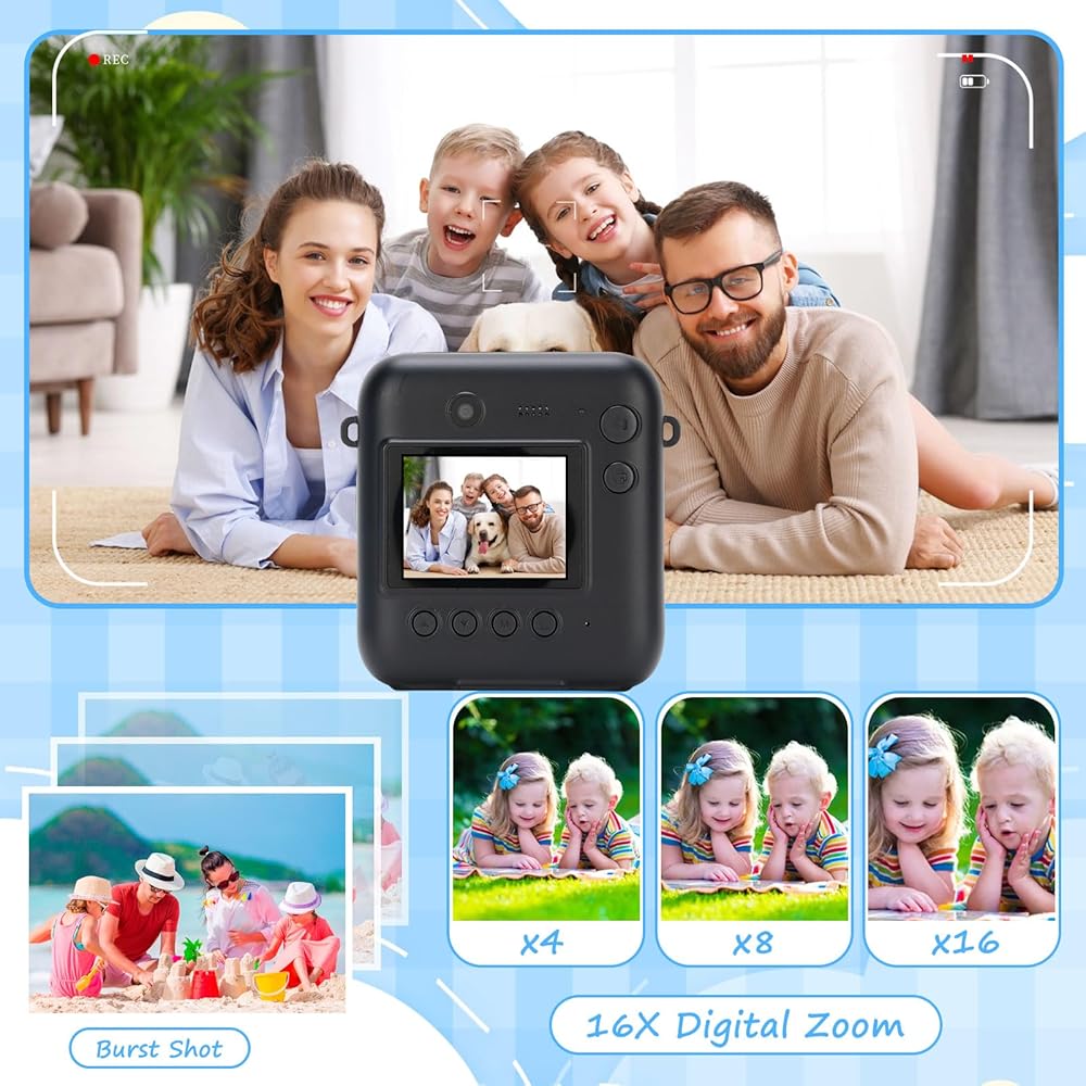 A safe and easy-to-use device for children to take photos without adding ink. With 4 rolls of thermal paper, kids can take as many photos as they want and experience the fun of instant printing. FHD 1080P camcorder enables instant selfies and blogging. Multifunctional kids' digital cameras are loved by children, allowing children to recreate innocence and imagination, and record memorable times.