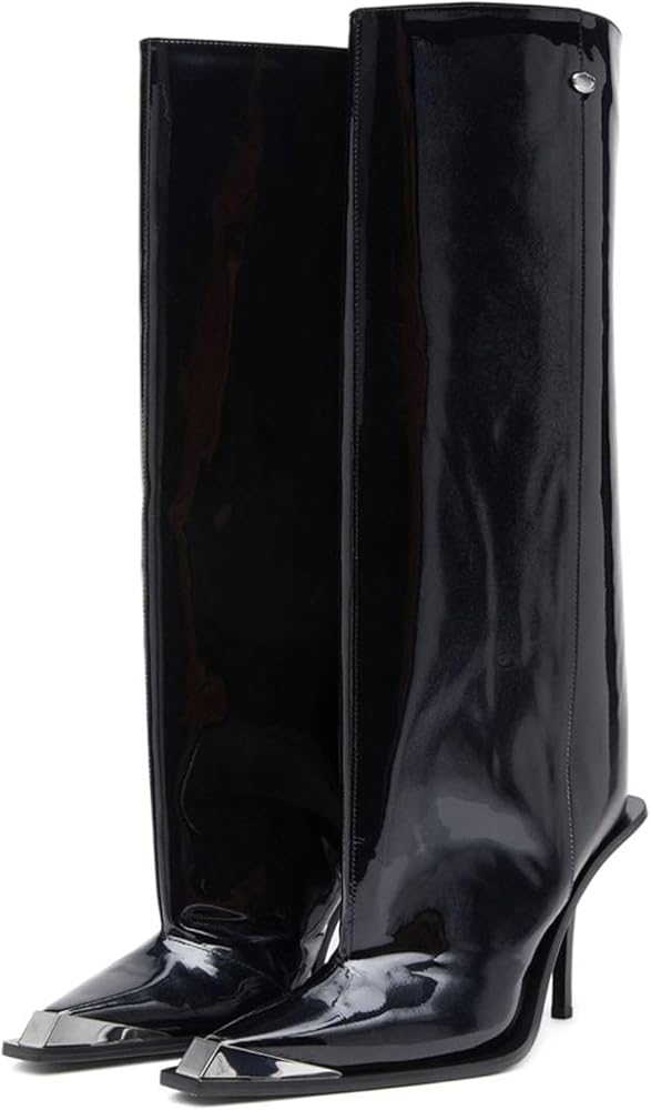 【Simple Special Design】: These metal pointed toe knee-high boots have a sophisticated silhouette. Crafted from premium black patent leather with a glossy finish. Simple solid color design for a modern aesthetic.