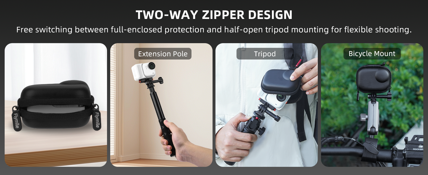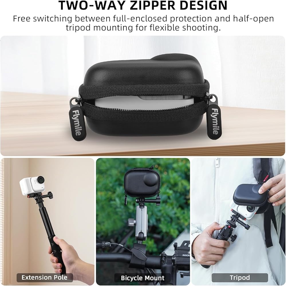 【Portable & Ready-to-Use Mounting】The small storage bag for the Insta360 GO Ultra is compact and portable, equipped with a convenient carabiner and wrist strap. It can be flexibly attached to backpacks, belts, or wrists, keeping your hands free for enhanced convenience. The smooth bidirectional zipper design allows quick access to the camera without removing the tripod, significantly enhancing usability and efficiency during outdoor shooting and travel.