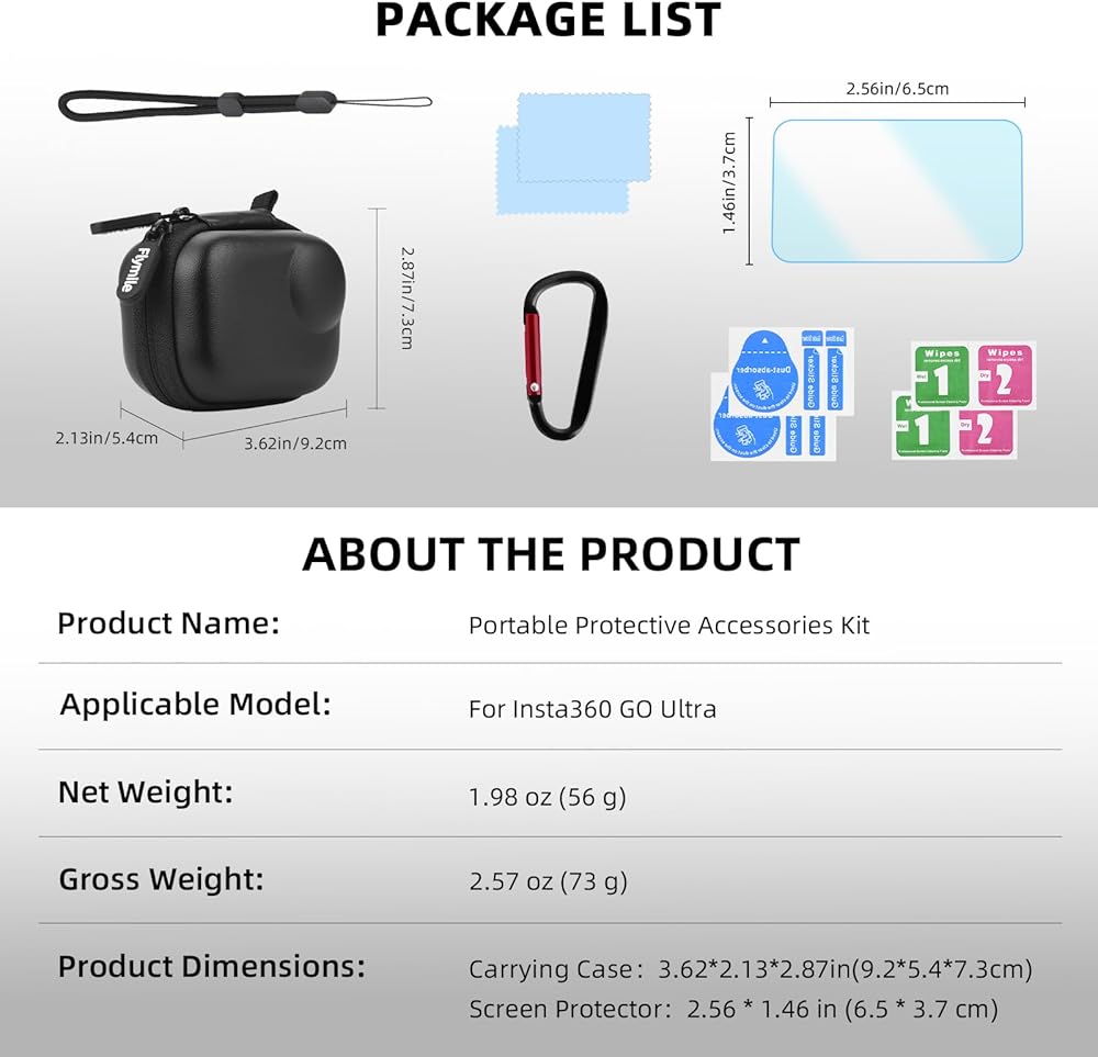【Perfect Compatibility】This protective kit for the Insta360 GO Ultra camera includes 1 mini carrying case and 2 pieces of 10H high-definition screen protectors. Featuring a precision-molded design, it fits the camera body seamlessly to deliver uncompromised protection. Note: Camera body not included.