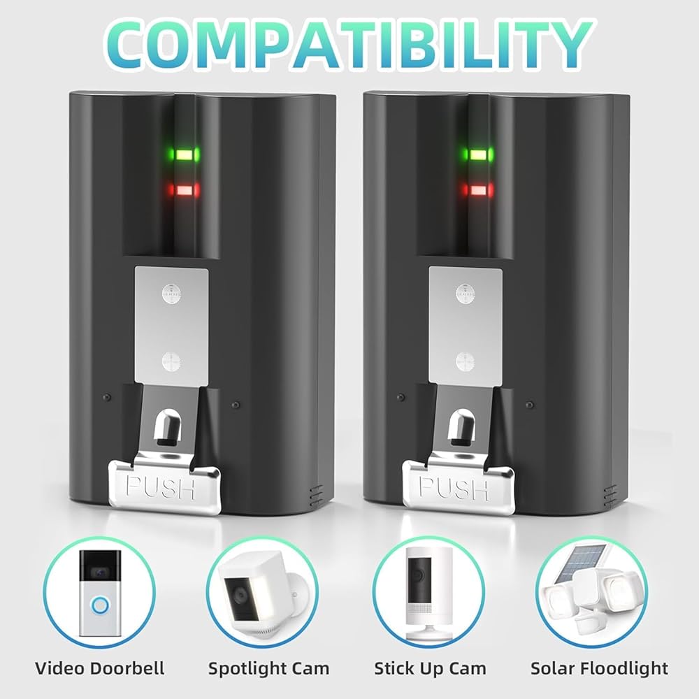 【DUAL CHARGING METHODS】Built-in charger port, you can charge them using a charging cable with a micro-USB port. our ring camera battery 2 pack can be conveniently charged using any 5V USB ports, such as a PC, car charger, or power bank. Additionally, our charger station enables simultaneous charging of up to 2 Ring batteries. This allows you to effortlessly swap out the batteries of your Ring cameras, reducing the downtime and ensuring uninterrupted surveillance