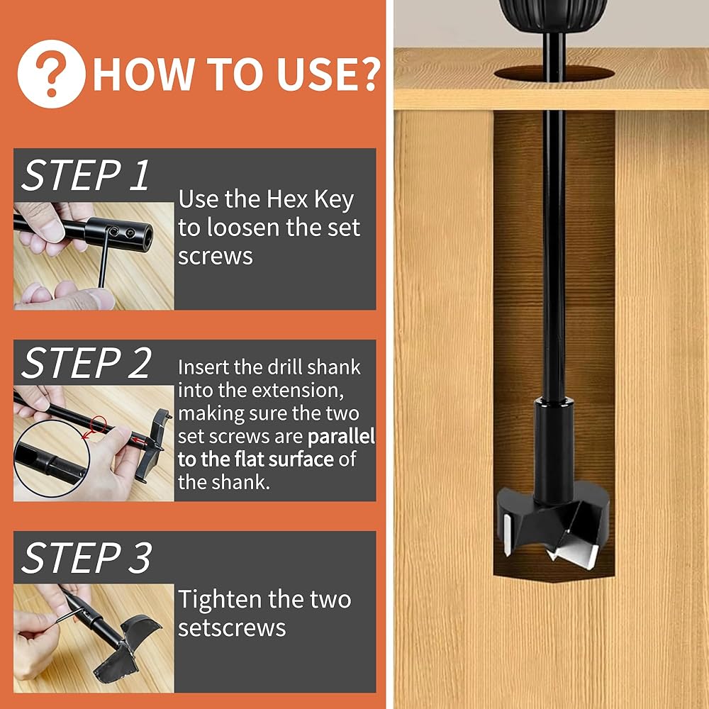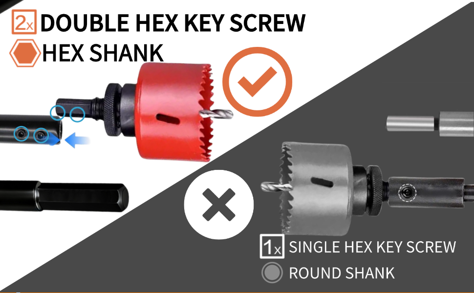 【Double Sliproof Design】The hole saw extension built-in dual anti-slip hex screws for enhanced bit and drill jaw stability. 2 anti-slip hex screws delivers secure grip, zero wobble, and reduced torque loss—eliminating slippage issues of traditional extensions in hardwood applications. Includes two Allen keys for convenient adjustments. This greatly reduces the risk of safety accidents caused by drill bit falling off during operation.