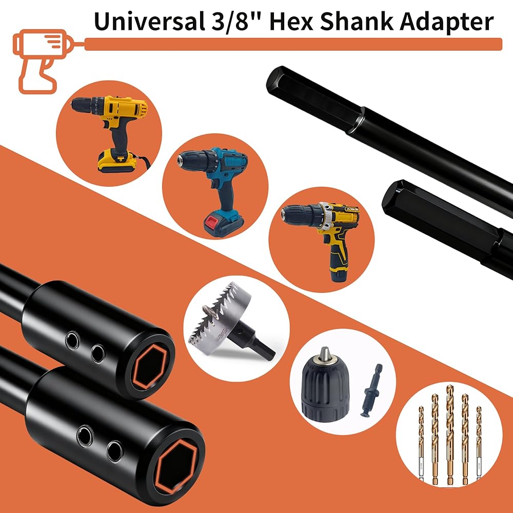 【Universal 3/8" Hex Shank Adapter】Drill bit extension build-in universal 3/8" hex shank adapter with broad compatibility. Fits most Forstner bits, hole saws, standard 3/8" (or slightly smaller) hex shank tools. Compatible with rotary tools, screws, nuts, drills, hand drivers and tool boxes. Delivers versatile access across diverse working needs.