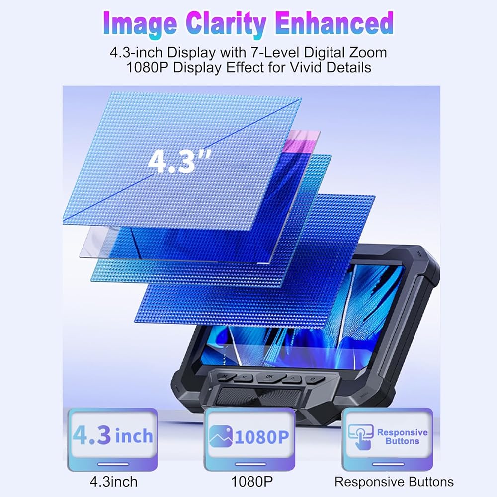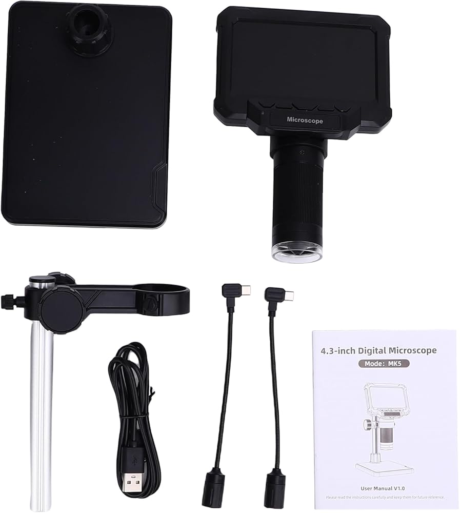 【4.3 Inch Screen and 1080P HD Imaging】This digital microscope features a 4.3-inch HD screen with 1080P resolution, allowing for clear and detailed viewing. The 10MP camera captures clear images/videos, suitable for inspecting, stamps, or soldering work. The anti->glare black base enhances clarity, while the 45° adjustable screen reduces neck strain for prolonged use.