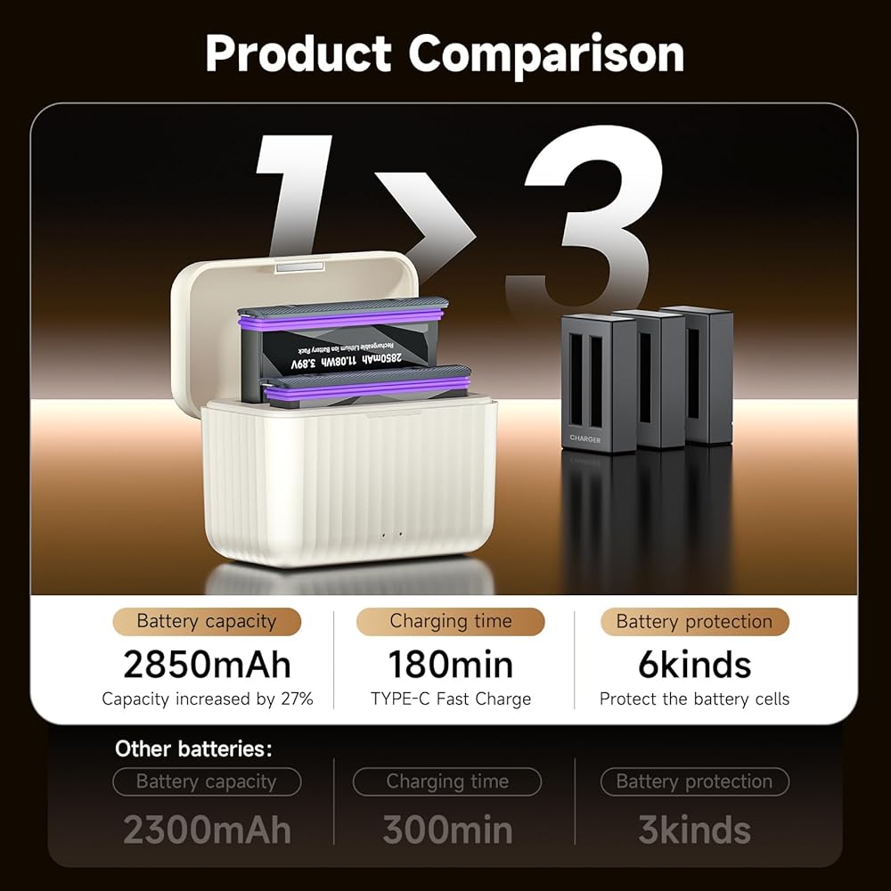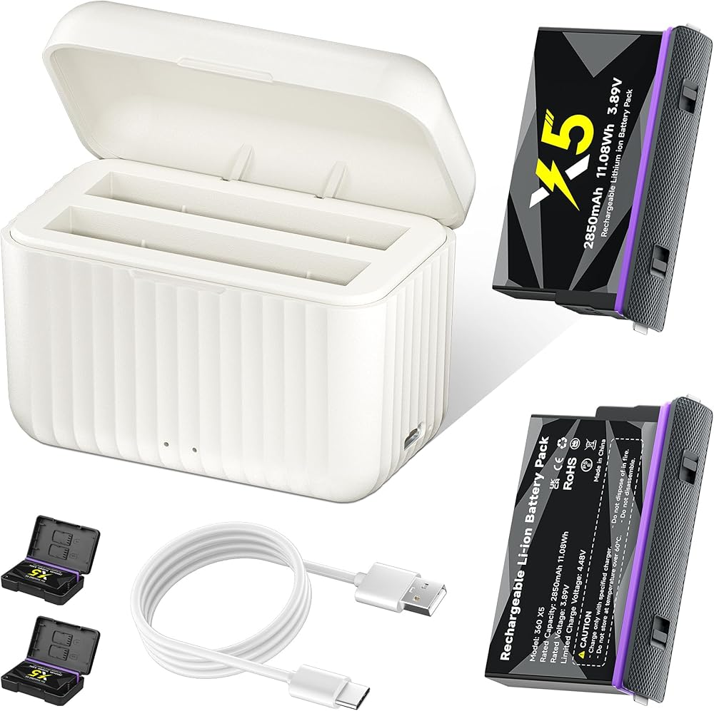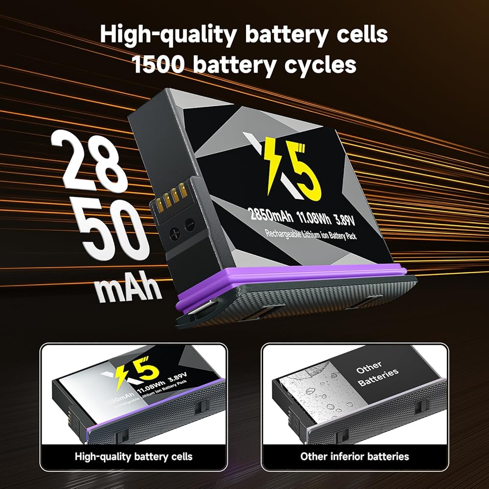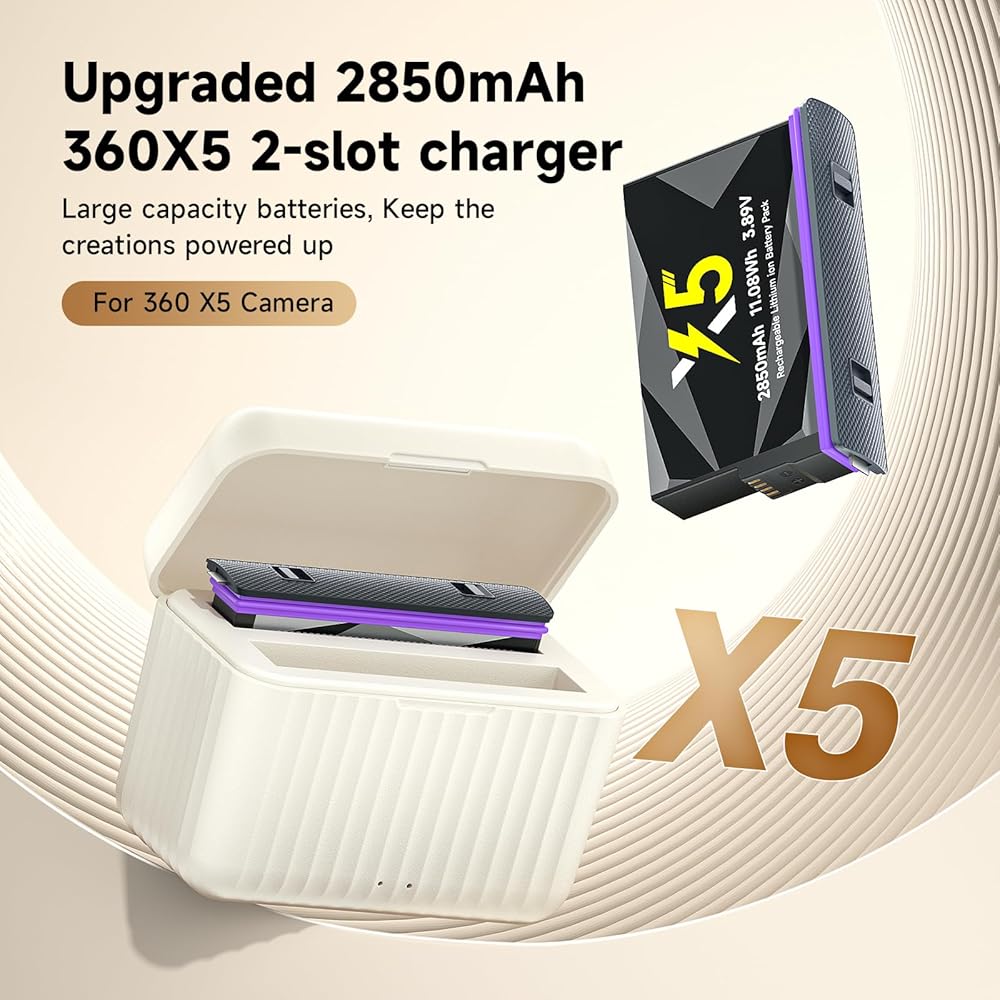 2850mAh high capacity 360 x5 batteries provide a long lasting of photo shooting and video recording for your Insta360 X5 camera. About 500 recharge cycles over the battery life. Fully compatible to your X5. Support power level display on the screnn as the original battery. Lightwight for easy carrying and installing
