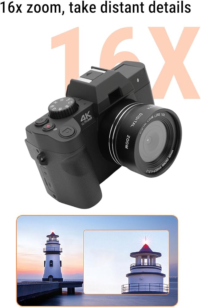 3. Get Up Close Without Moving a Muscle: Never miss a detail with the powerful 16X zoom feature. Ideal for wildlife enthusiasts, concert-goers, and parents on the sidelines, this travel camera lets you capture intricate subjects from afar. It solves the problem of being stuck in one spot, allowing you to snap clear photos of distant landmarks or candid moments without sacrificing the quality of your image or your comfortable viewing position.