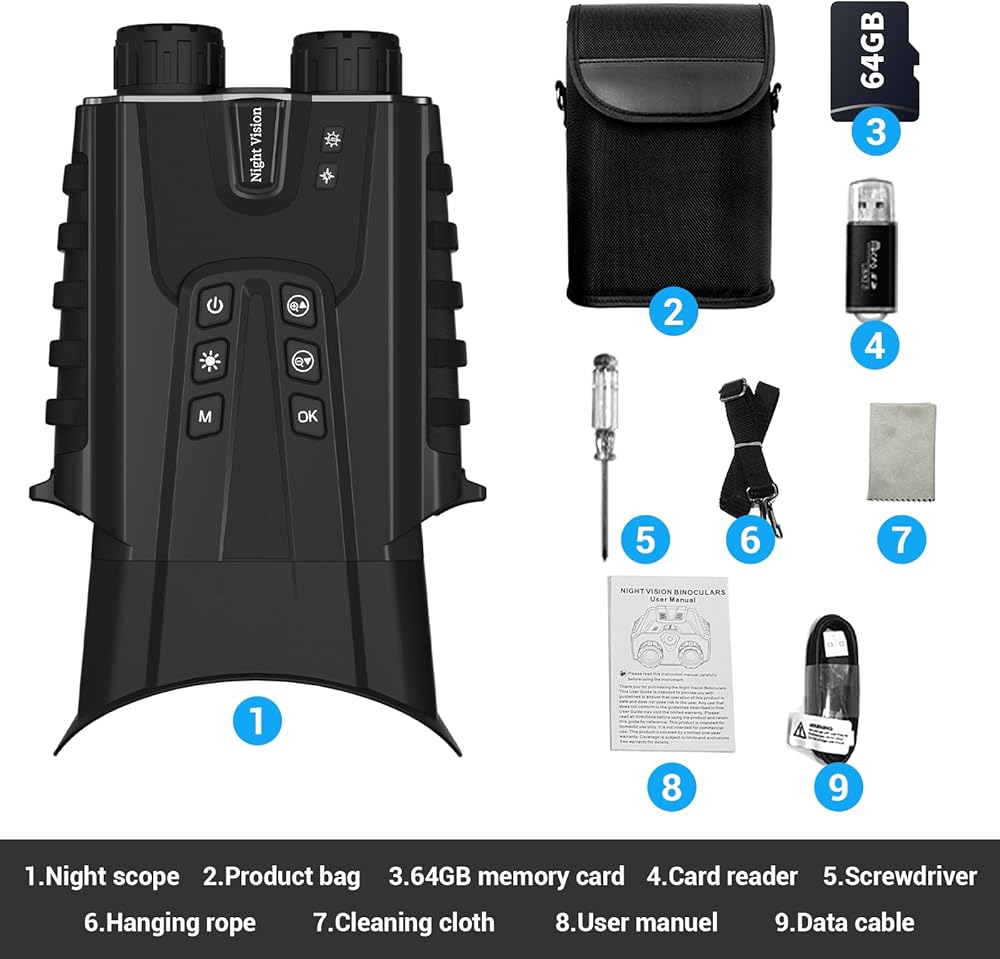 • 『 3.2'' Large HD Display 』: Night vision goggles with a 3.2" screen, 3.2" Lcd Display Magnified 7-Inch Cinema-Like Screen, allowing you to view crystal-clear photos and videos. The included 64GB memory card, expandable up to 128GB,Seamlessly transfer videos and images to your computer via Type-C charging cable for further editing and sharing.
