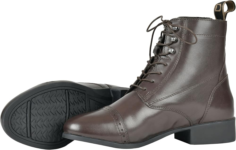 The Dublin Foundation Laced Paddock Boots II combine timeless style with unmatched functionality, making them an essential addition to every equestrian's wardrobe. Whether you're spending long hours at the stables, going for a casual ride, or simply looking for a classic paddock boot, these boots deliver exceptional comfort and durability. Crafted from full-grain quality leather, they not only look polished but are built to stand up to daily wear. The stylish punched toe cap adds a touch of sophistication, while the branded nylon pull tab offers both practicality and a sleek branded touch. With a speed lacing system, getting the perfect fit is easy and quick, ensuring you're ready to saddle up in no time.