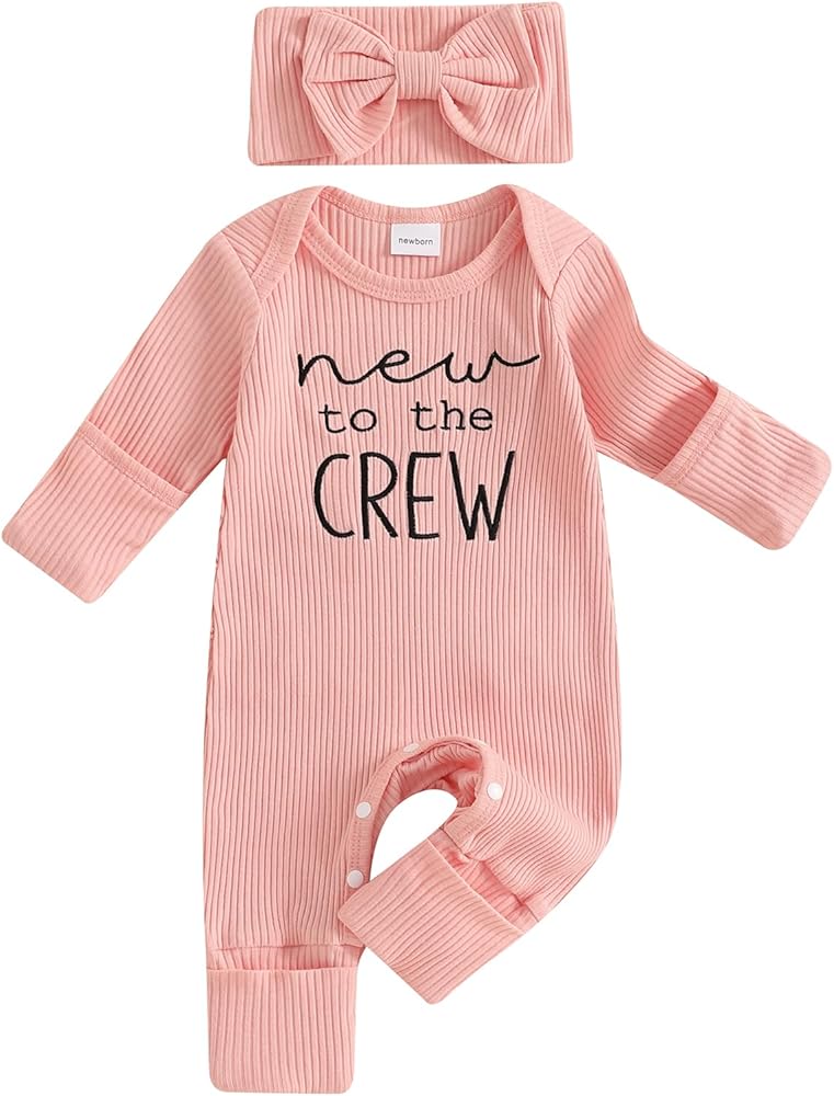 Features: Infant girl romper; Long sleeves round neck letter embroidery ribbed full length romper; Baby romper crotch with snap design, easy to wear and take off, super cute