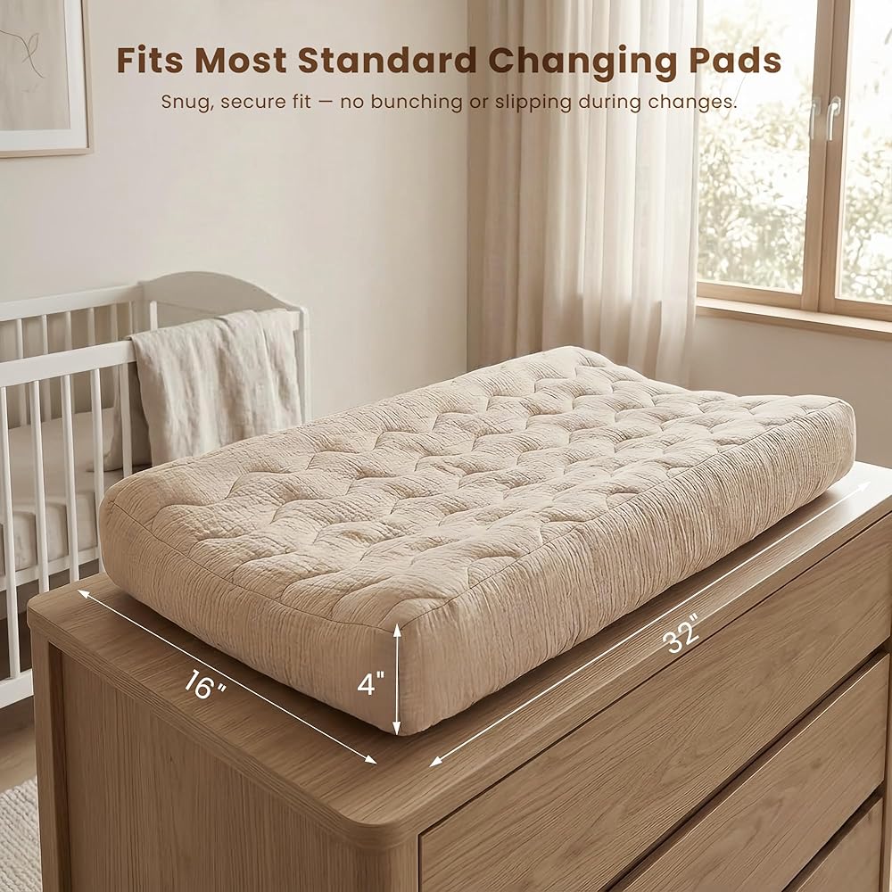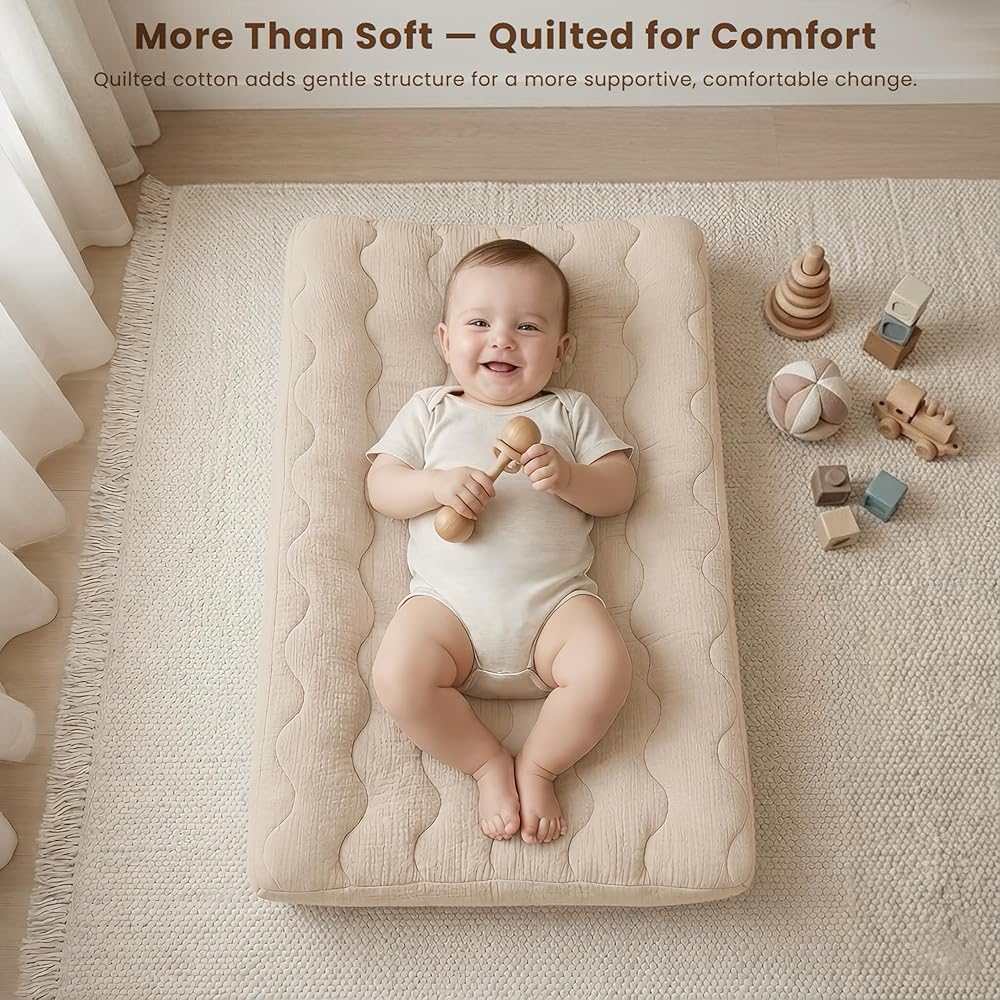 CLOUD-SOFT 100% MUSLIN COTTON – Premium breathable cotton top with quilted texture feels like a cozy cloud. It creates a soft, cozy barrier between your baby and the cold changing pad. Hypoallergenic and gentle on newborn skin