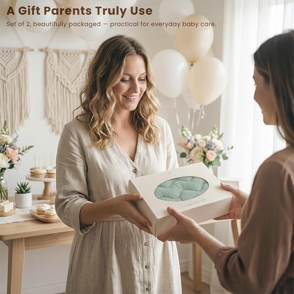 ESSENTIAL 2-PACK SET – Accidents happen. Since muslin is absorbent, having a backup is a lifesaver. When one cover is in the wash, have a fresh one ready instantly. Comes in a gift box, making it the ultimate neutral Baby Shower gift