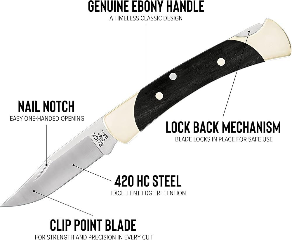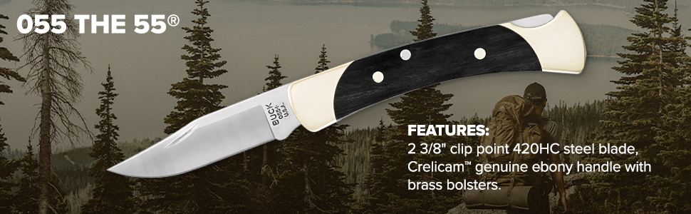 Buck Knives, in partnership with Taylor Guitars, is proud to offer sustainably sourced ebony wood as a new handle material for The 55. The 55 is a classic gent's knife for everyday carry. It's a half-size version of our legendary 110 Folding Hunter with an updated design. When it comes to folding hunting knives, there's nothing like The 55 Knife from Buck Knives. With a classic crescent tip with thinner blade and sharper point, this knife is perfect for anything you have to do once you put down that prize buck. The 55 Knife is also forged from 420HC Stainless Steel so it can take and hold an edge exceptionally well. PLEASE NOTE - Due to the change in handle material for 2020, may still have the American Walnut handled versions in stock. You will receive either the American Walnut OR Genuine ebony handled knife.
