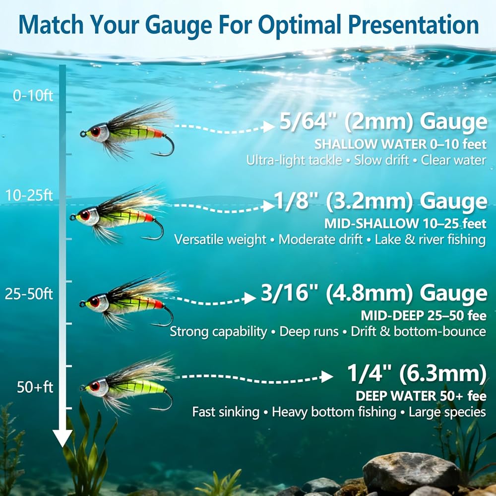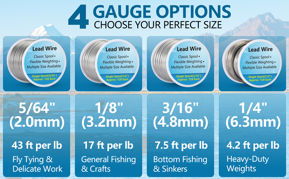 4 GAUGE OPTIONS FOR EVERY APPLICATION — Select your ideal diameter with precise length per pound: 5/64" (43 ft), 1/8" (17 ft), 3/16" (7.5 ft), or 1/4" (4.2 ft). Thinner gauges perfect for fly tying and delicate work; heavier gauges ideal for bottom fishing and heavy duty weighting