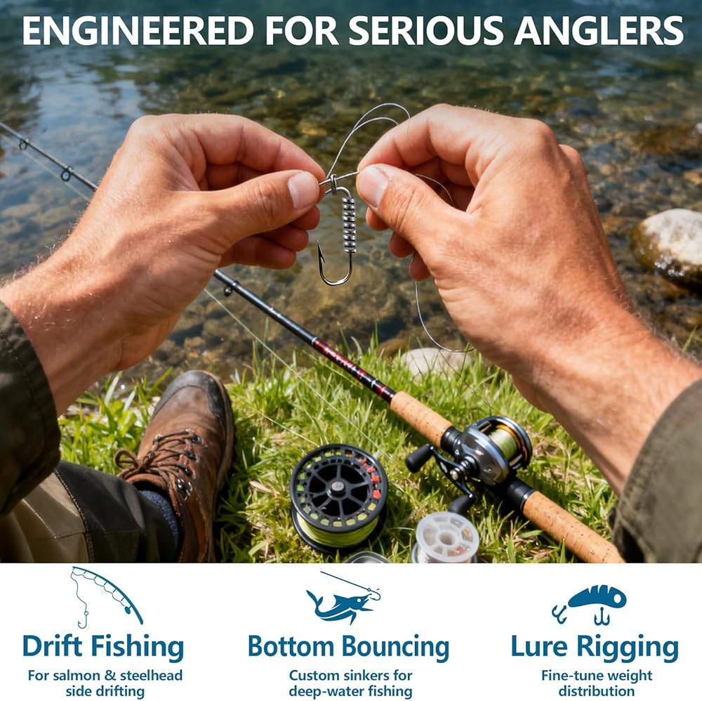 ENGINEERED FOR DRIFT & HEAVY-DUTY FISHING — Optimized for salmon and steelhead side drifting, bottom bouncing, and deep-water applications. Creates custom sinkers, weights nail knots, and adds precise weight distribution to lures and rigs