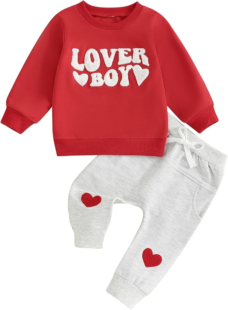 Toddler Baby Boy Clothes Valentines Day Outfit Lover Boy Heart Embroidered Crewneck Sweatshirt + Joggers Pants Sets