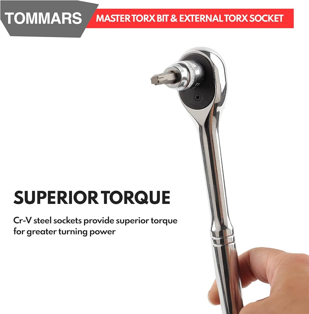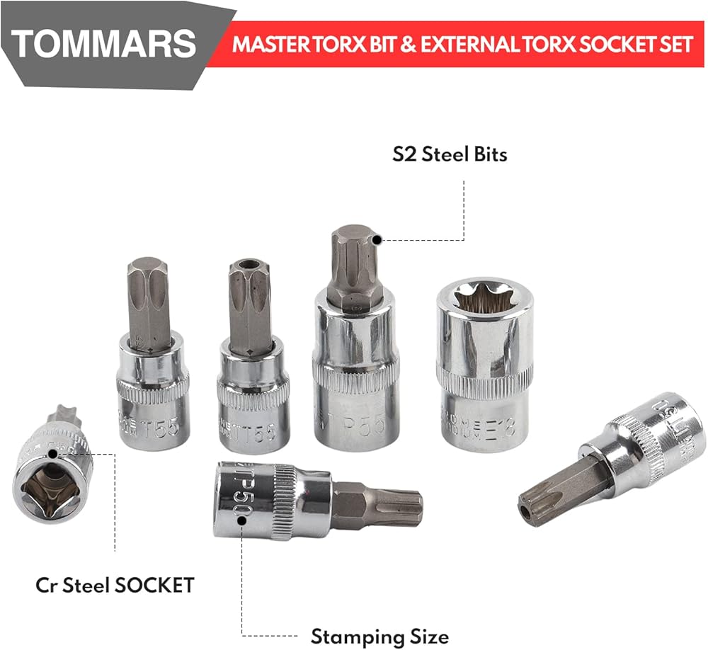 TOMMARS 60-Pc Master Torx Bit Socket and External Socket Set 1/4", 3/8", 1/2" Drive, S2 Steel Bits, CRV Sockets E4-E24, T6-T70,TT6-TT70,TP8-TP60