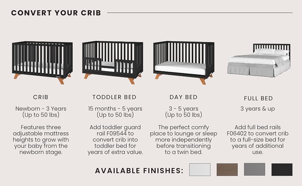 Grows With Your Baby: Baby crib can be converted into a toddler bed, day bed and full-size bed with the addition of toddler guard rail (F09544.46) and Hollywood bed frame (F06402.44), sold separately. Strong metal mattress support adjusts to 3 positions to fit the growing needs of your child and is compatible with the Child Craft Dream Catcher Mattress (F04638.44), sold separately.