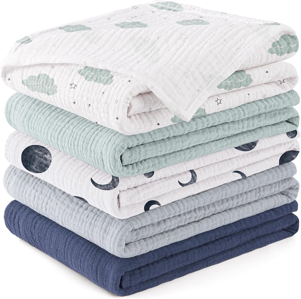 Baby Daily Essentials: This 5-pack baby burp cloths is crafted from 100% pure natural muslin cotton, ideal for your baby's daily needs. The muslin burp cloths are soft, breathable, skin-friendly and highly absorbent, making them a go-to choice for infant daily care