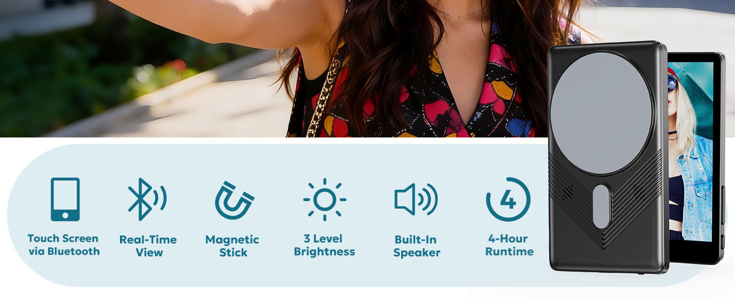 تصميم مزدوج مغناطيسي ومحمول باليد: مزودة بحلقة مغناطيسية، يتم ربط الشاشة بأمان بحافظة هاتفك للاستخدام بدون استخدام اليدين، أو فصلها على الفور للتشغيل باليد. شاشة سيلفي مقاس 4 بوصات سهلة الحمل، مثالية للتصوير في الهواء الطلق أو في الداخل