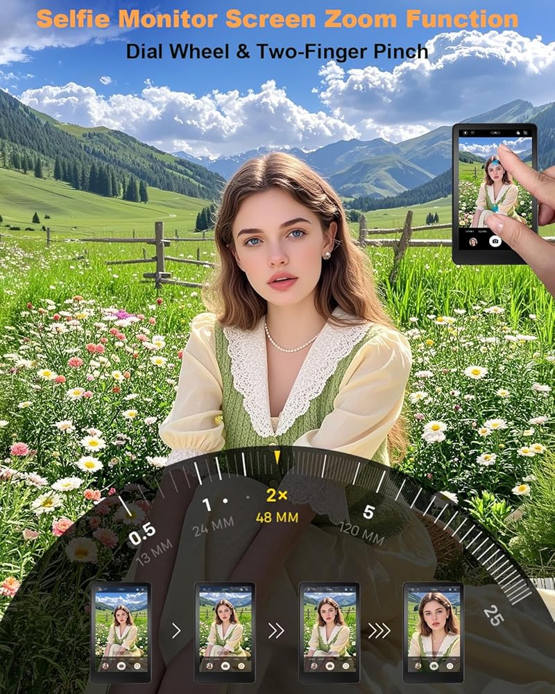 بطارية طويلة الأمد واستخدام متعدد الاستخدامات: توفر البطارية بسعة 1500 مللي أمبير في الساعة ما يصل إلى 4 ساعات من الاستخدام المتواصل، وتدعم جلسات التصوير الكاملة في المنزل أو في المقاهي أو في الشارع أو أثناء السفر. تعتبر شاشة الكاميرا الخلفية مناسبة لمنشئي المحتوى وعشاق وسائل التواصل الاجتماعي والمسافرين وحافظي الذاكرة اليومية على حد سواء