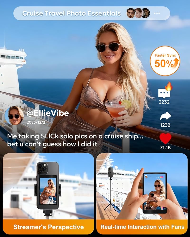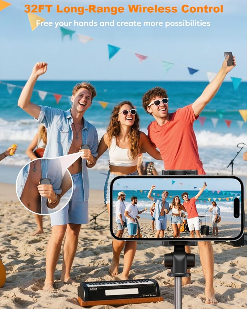 جهاز تحكم عن بعد بطول 32 قدمًا ومراقبة في الوقت الفعلي: قم بتوصيل شاشة الكاميرا الخلفية عبر البلوتوث وتحكم في هاتفك عن بعد من مسافة تصل إلى 10 أمتار. قم بمعاينة التكوين والتركيز والتعرض في الوقت الفعلي على شاشة الصور الشخصية. تبديل الأوضاع، أو ضبط التركيز، أو بدء/إيقاف التسجيل دون التحرك ذهابًا وإيابًا - وهو مثالي لالتقاط محتوى منفرد ثابت وعالي الجودة