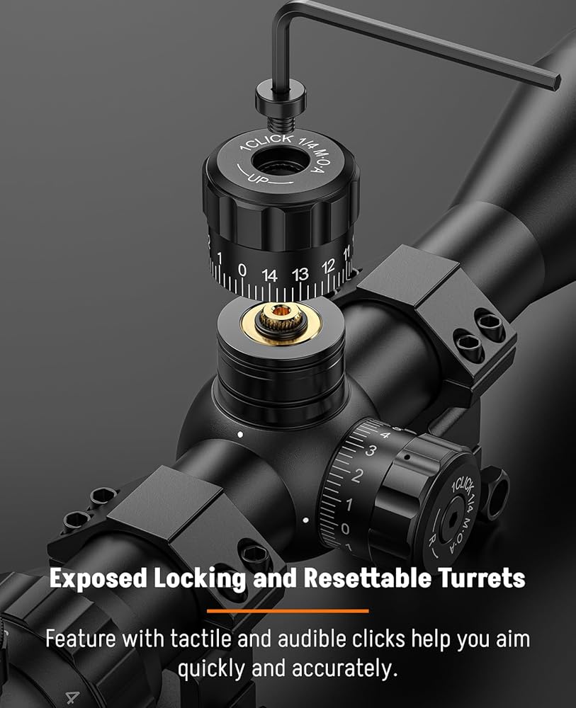 Precision Locking Resettable Turrets: Features easily adjustable exposed locking turrets that offer audible and accurate 1/4 MOA clicks with a quick resettable to zero after sighting in. Max Windage/Elevation Adjustment: 60 MOA