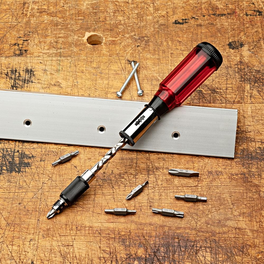 9.75" Yankee Screwdriver - Semi Automatic Screw Driver Pin Vise Hand Drill with 7 Double-Sided Bits, Rotating Barrel, Hex Chuck, and 3-Position Locked, Spiral-In or Spiral-Out by Kings County Tools