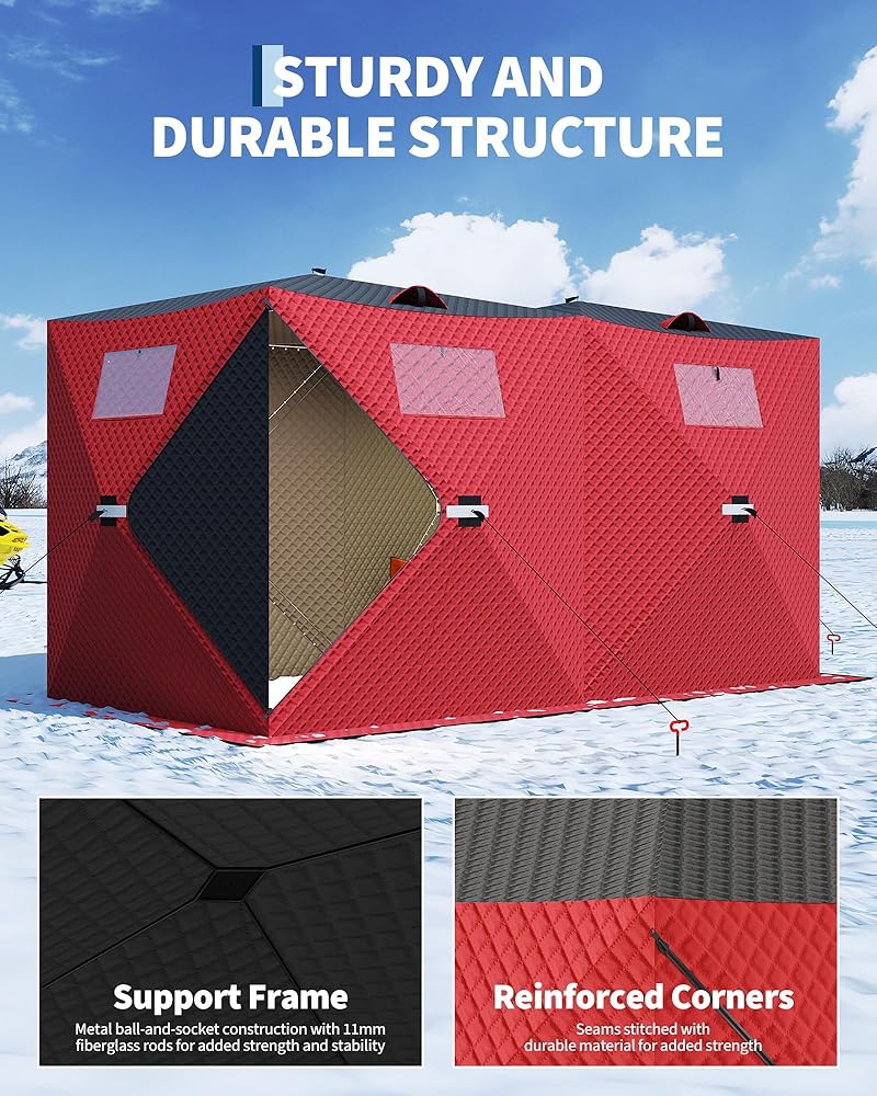Reinforced Stability & Durability: Featuring a sturdy frame, tear-resistant shell, and reinforced corners, this shelter stands up to strong winds and heavy snow. Secure your tent with 4 included wind ropes and 8 ice anchors.