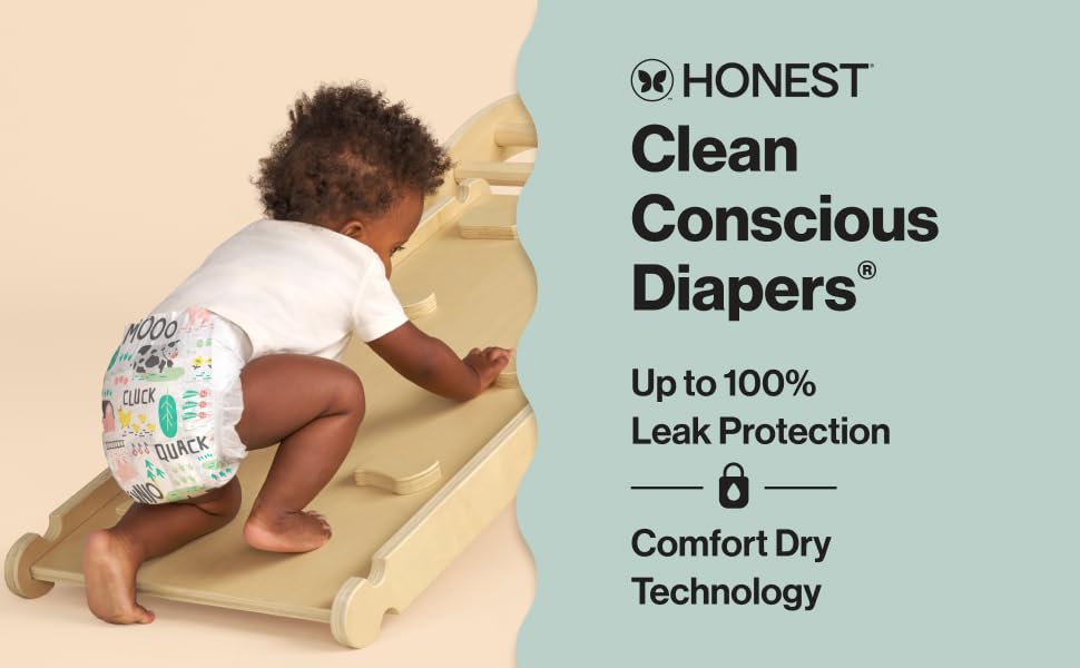 Designed to protect delicate skin, Honest Clean Conscious Diapers keep baby comfortable and dry through all the wiggles and wobbles! Our softest diaper yet delivers up to 100% leak protection with Comfort Dry Technology. The hypoallergenic, plant based inner liner, flexible stretch wings, super absorbent core, and channel technology provide a comfy, secure fit for all ages and stages. Because safety is top priority, these diapers are OEKO-TEX STANDARD 100 Certified, a 3rd party that tests for 350 harmful chemicals, and made with FSC Certified Fluff Pulp and other controlled materials. And for cuteness overload, each diaper features a super cute print!