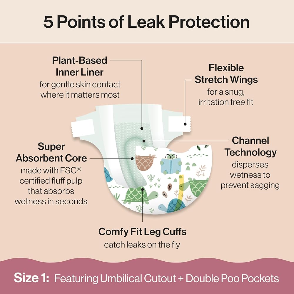 The Honest Company Clean Conscious Diapers for Sensitive Skin, Up to 100% Leakproof, Hypoallergenic, Fragrance Free, Turtle Time, Polybag, Size 1 (8-14 lbs), 35 Count