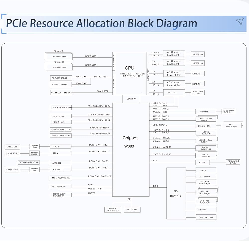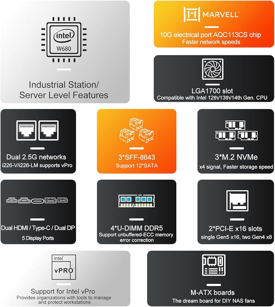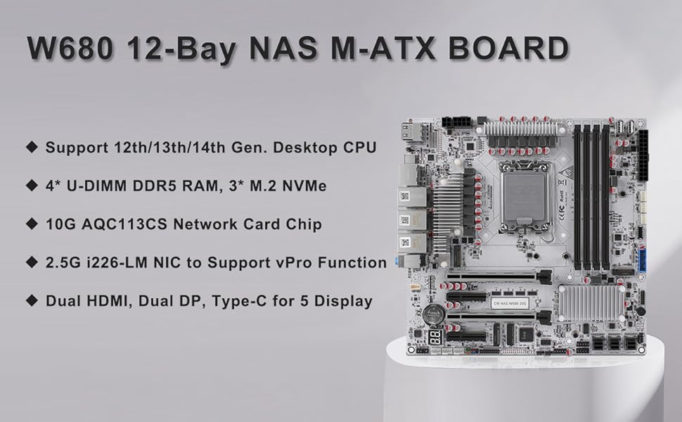 LGA1700 Socket: W680 12-Bay NAS board is compatible with Intel Core i3/i5/i7 12th/13th/14th Gen. desktop processors, and we recommend the T-Series desktop processors, which are more energy efficient. It's 9.6" x 9.6" Micro ATX form factor, basic TDP is 125W, and it supports Windows 10/11, Linux