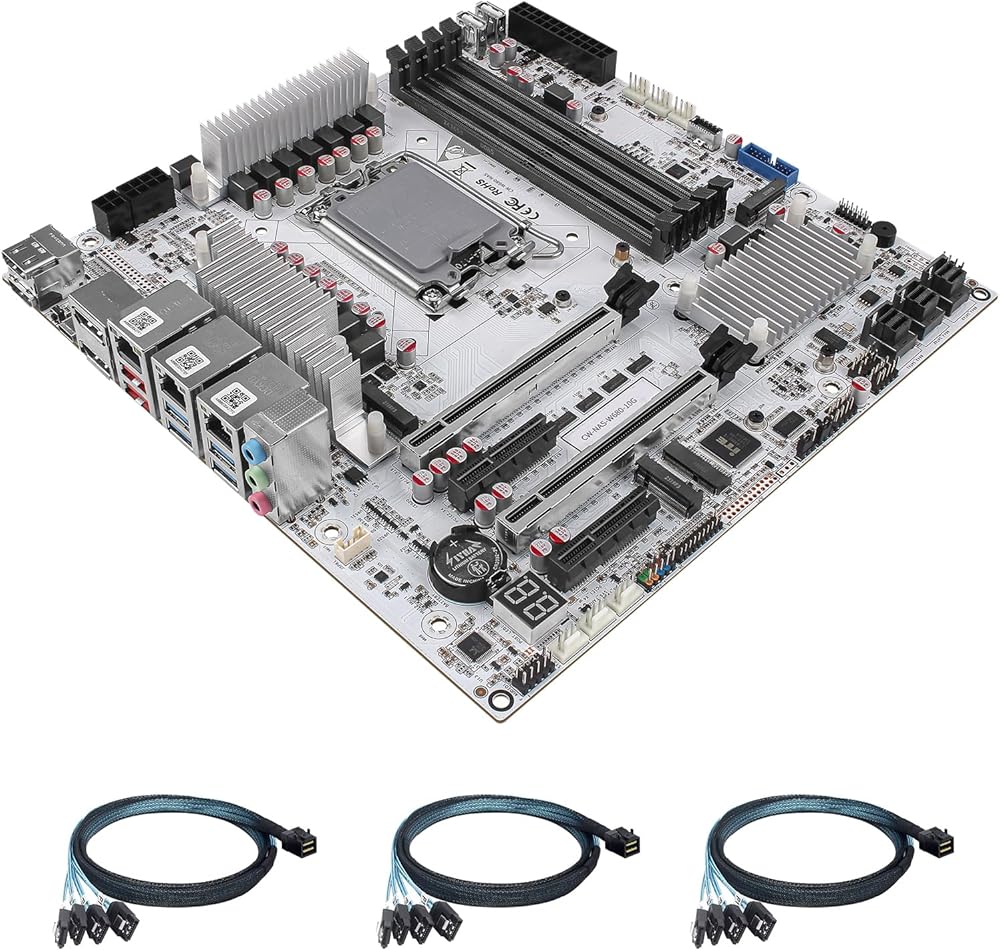 Heat Dissipation: It is compatible with LGA1700 series processors cooling fan. Package includes 1x W680 12-Bay NAS M-ATX motherboard, 3x SFF-8643 cable, 1x I/O Shield, some screws, 1x warranty card