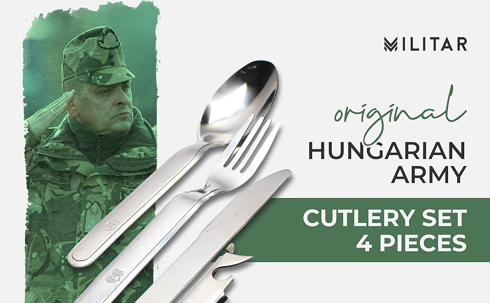 Original Hungarian army cutlery set 4 pieces. Eating utensils military issue spoon fork knife kit flatware multi-tool Camping bottle can opener stainless steel NEW