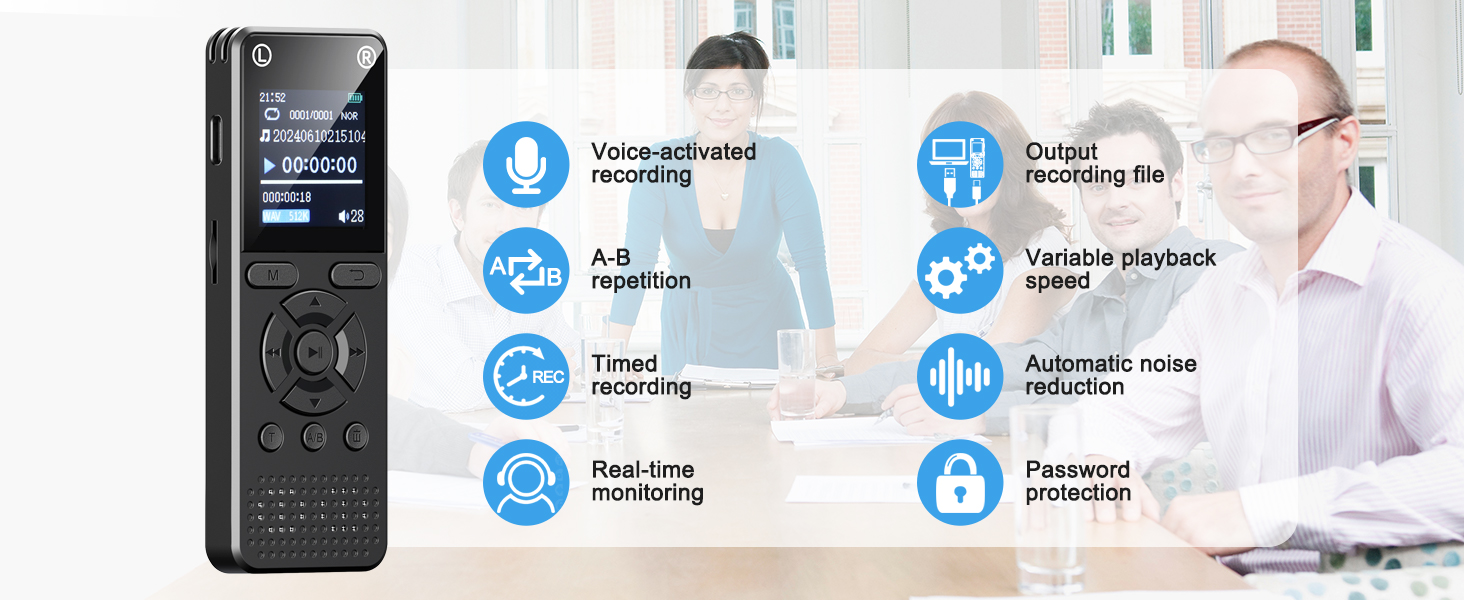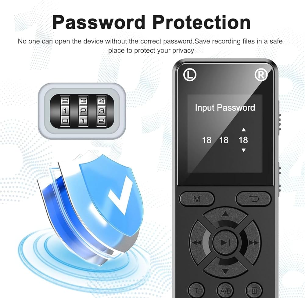 Built-in Speaker, A/B Repeat & Password Protection: Listen instantly with the built-in speaker or use headphones for private playback. A/B repeat helps with language learning and review, while password protection keeps recordings secure. Transfer files easily via USB.