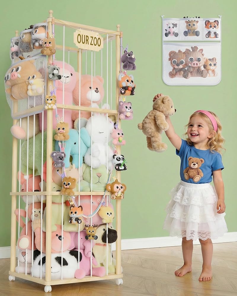 FUN & HABIT-BUILDING, LOCKABLE CASTERS:More than a toy storage organizer—it's a fun tool to foster kids' tidiness! Children will love the interactive "feeding" process of placing plush toys into the rack, naturally developing organizing habits through play. The stuffed animal zoo features 4 smooth-rolling casters at the bottom for easy mobility, with two equipped with step-on brakes to lock it in place during play, preventing sliding or tipping for safer use.