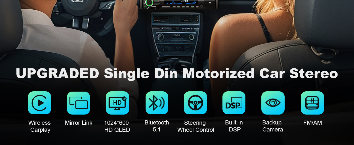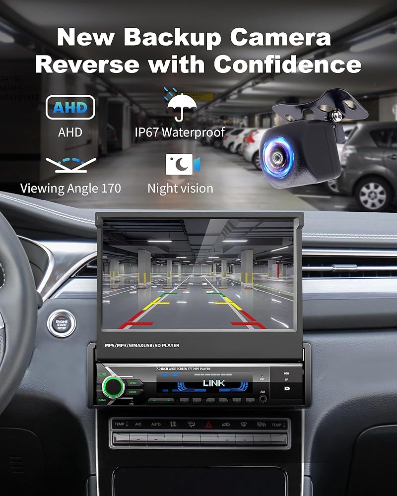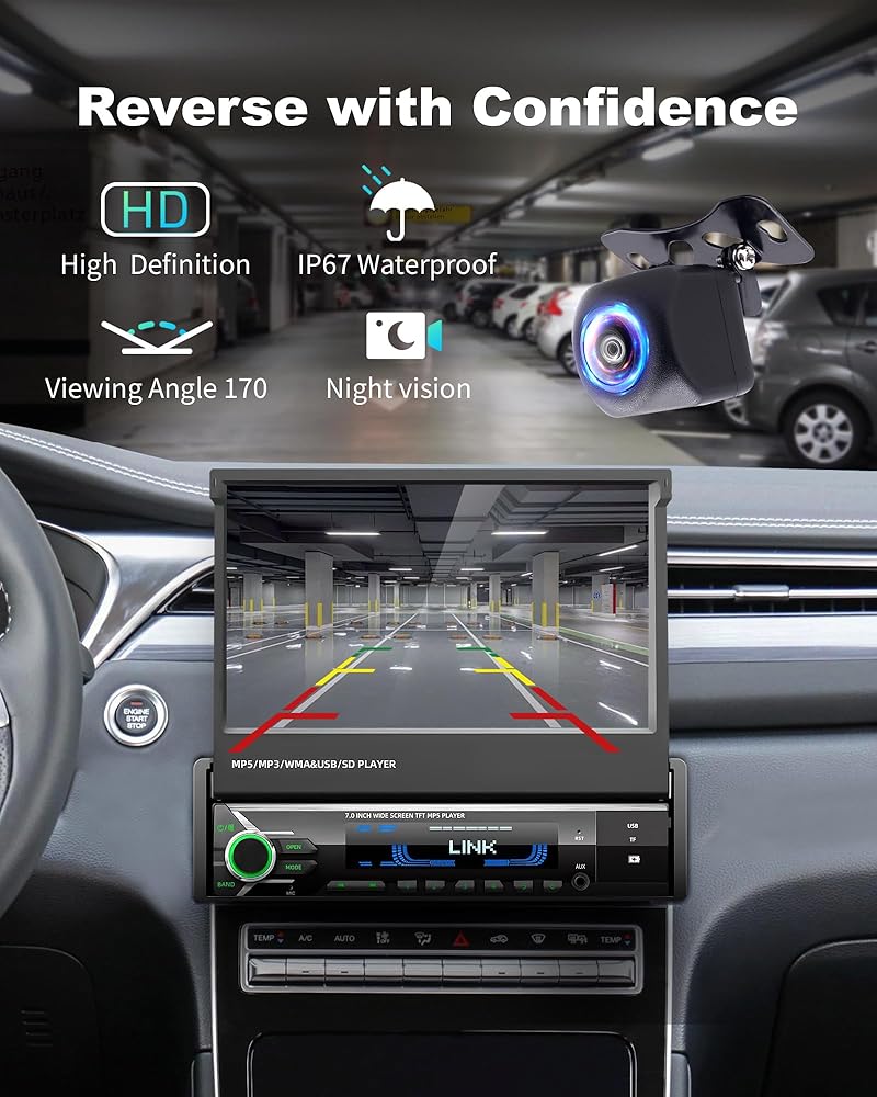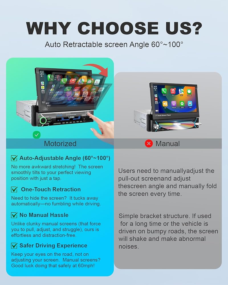 [Rock-Solid Motorized Flip-Out Screen | 3X Lifespan & Anti-Vibration] Say goodbye to wobbly, flimsy screens. Our Single Din Car Stereo features a heavy-duty servo motor and dual-track system, rigorously tested for 30,000+ cycles to deliver 3X the impact resistance of manual models. The brilliant 7-inch HD capacitive touchscreen stays perfectly stable on rough roads, ensuring a shake-free view. Plus, with Mirror Link, seamlessly display your smartphone's navigation and entertainment apps for a smarter drive.