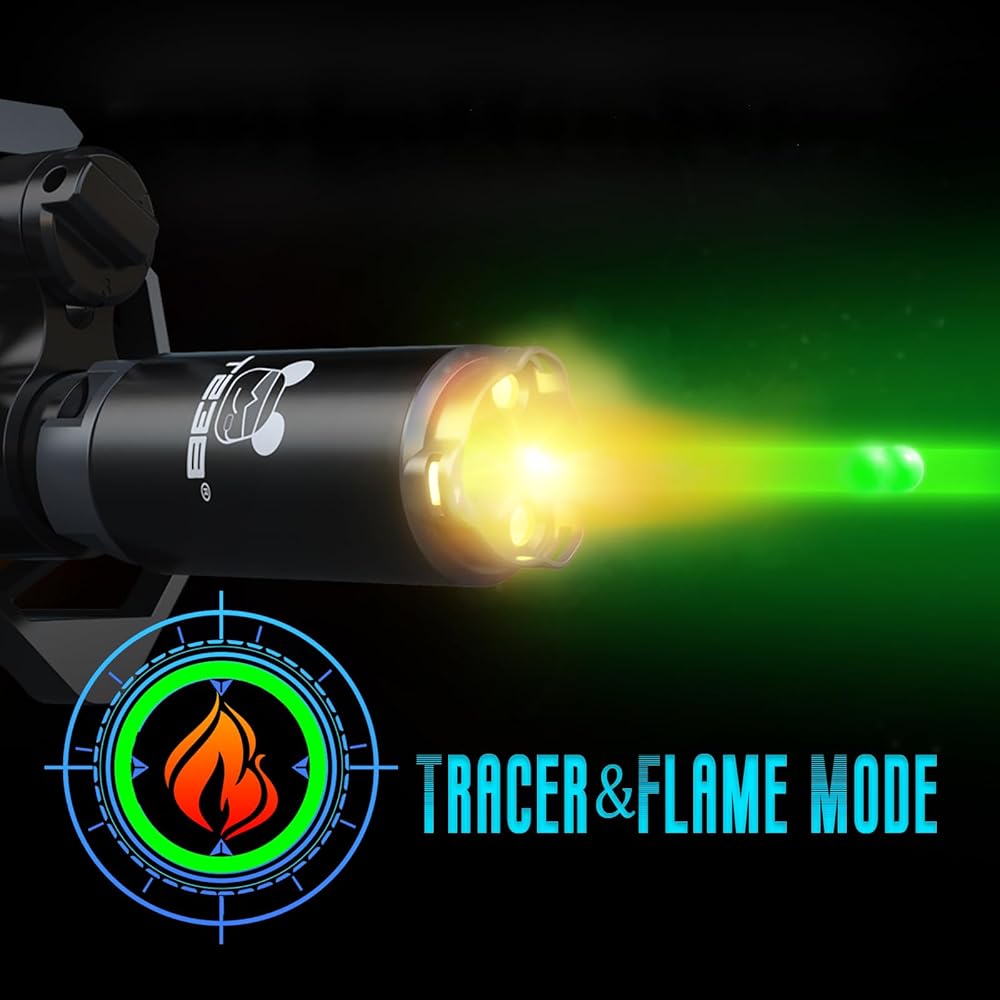 T238 Tracer Unit: 3 modes (Tracer, Muzzle Flash, Both). Reacts to green BBs, gel balls, and Nerf darts. Realistic muzzle flash with gas blowback. **Note: No Red BBs support.**