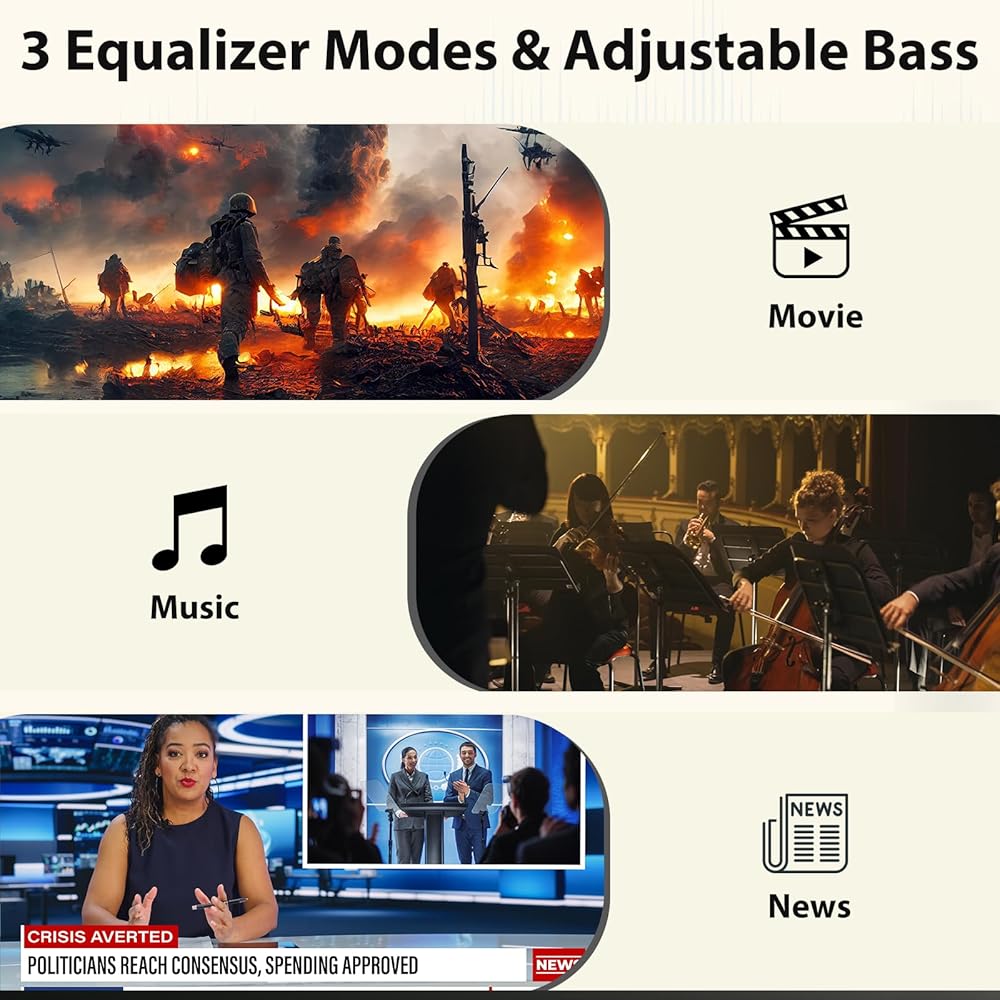 DSP with 3 EQ Modes: TV sound bar built-in DSP ensures stable audio performance. Choose from Music Mode for balanced sound, Movie Mode for cinematic surround effects, and News Mode for clearer vocals—so you never miss a detail