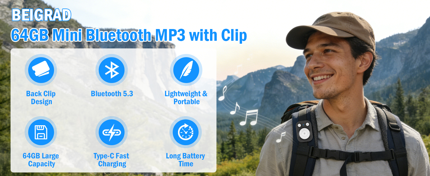 Mini MP3 Player with Bluetooth 5.3, 64GB Portable Music Player with Sports Clip, OTG Function, Mp3 Player NO Screen for Running/Cycling/Exercise-Student, Kid