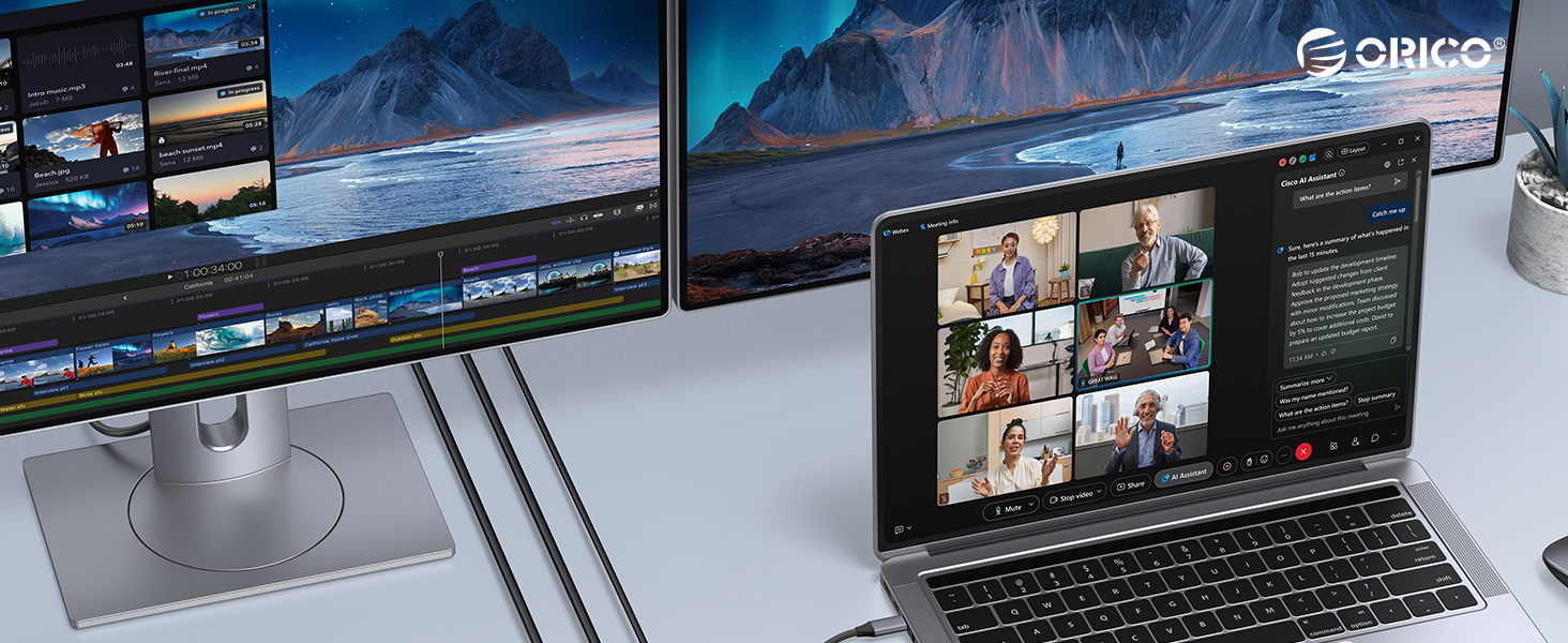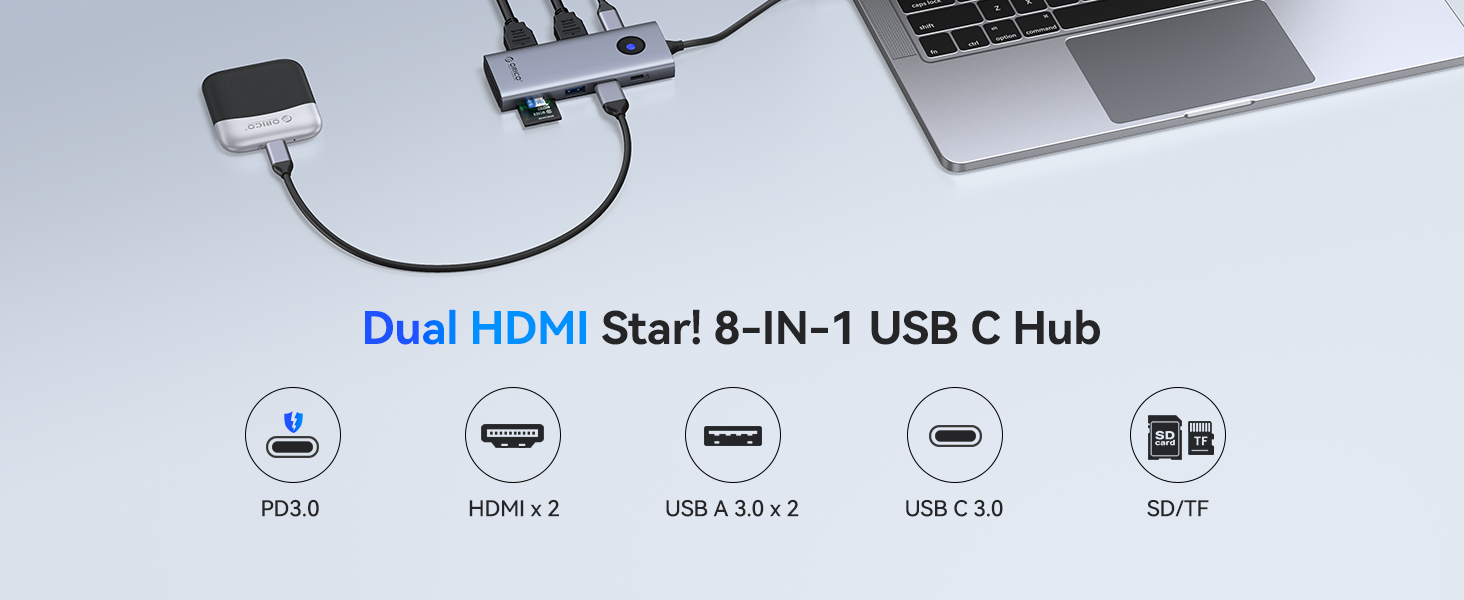 【8-in-1 Interface Expansion】: ORICO docking station features 2×HDMI(4K@60Hz), 2×USB-A/1×USB-C(5Gbps), SD/TF 3.0(simultaneous read) & 100W PD port. Supports multi-device connection (keyboard, SSD, monitor, etc.) to reduce plugging/unplugging hassle.
