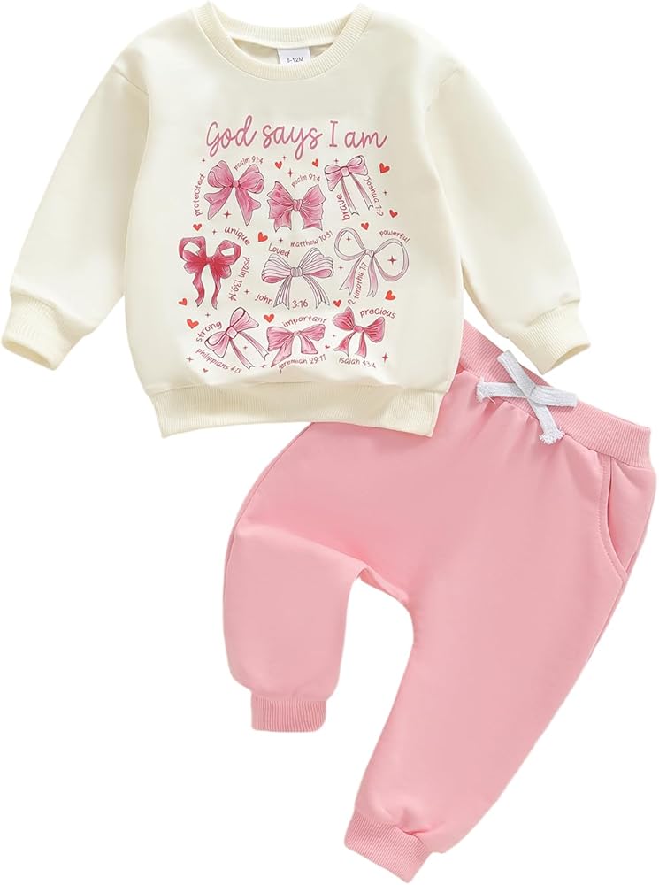 Feature with long sleeve round neck, elastic waist, letter print, bow print, god says i am sweatshirt tops pants 2pcs clothes set
