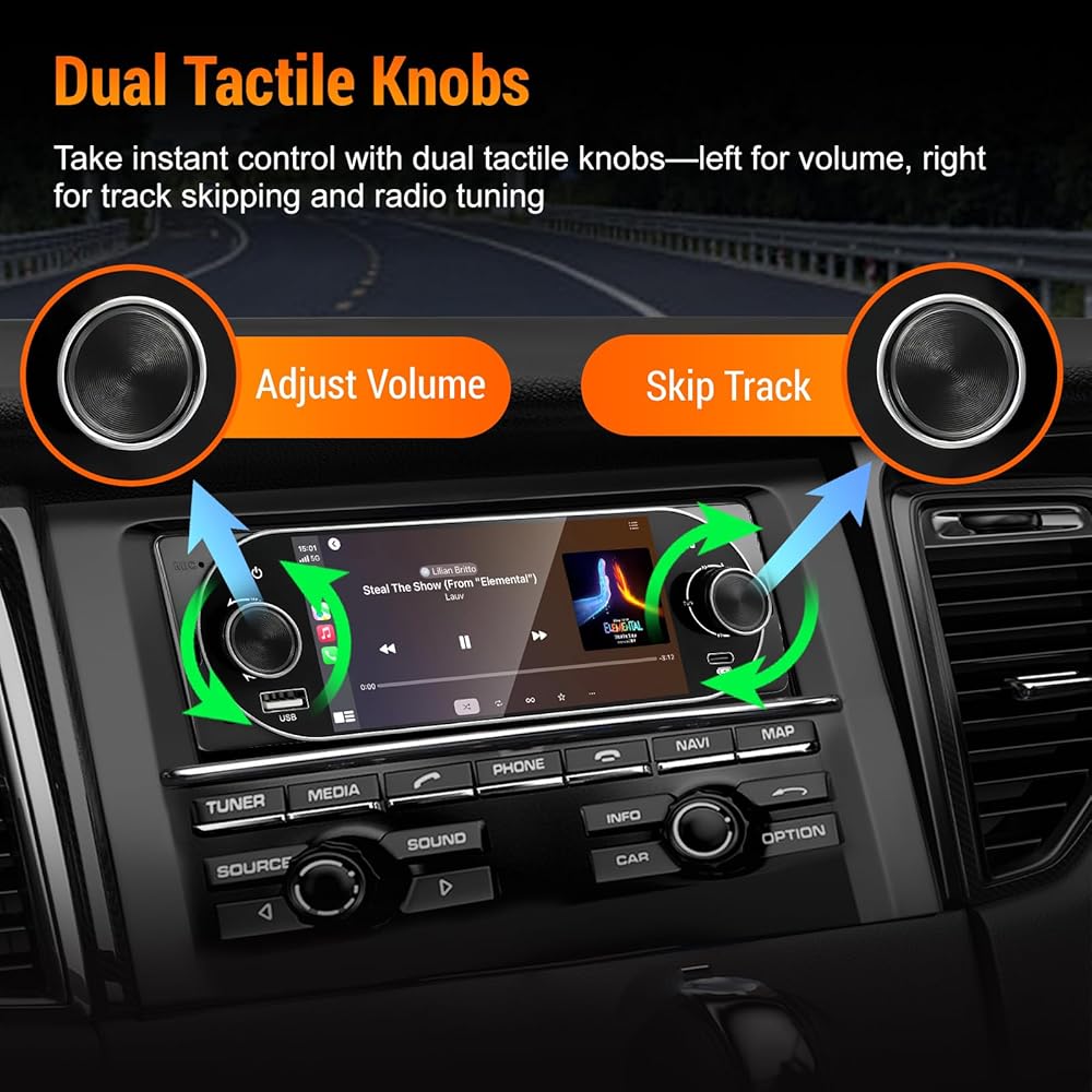 【Dual Tactile Control Knobs】: Take instant control with dual tactile knobs—left for volume, right for track skipping and radio tuning—making your single din car stereo easier and safer to operate.
