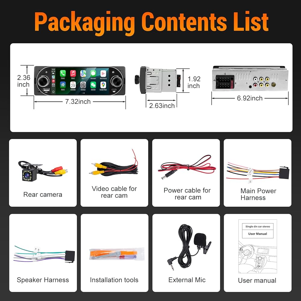 【Upgrade Your Drive with Smart Control】 Elevate your in-car experience with our advanced Single Din Touchscreen Radio. This feature-rich Car Radio Bluetooth system delivers seamless wireless CarPlay & Android Auto, integrating your smartphone for safe access to navigation, music, and communication directly on its responsive Carplay screen for car. 【New & Enhanced Features for Ultimate Convenience:】 *Dual Tactile Control Knobs: Enjoy intuitive, eyes-on-the-road operation. The left knob adjusts volume, while the right knob lets you skip tracks and tune the radio instantly. * Reliable Voice Commands: Once connected via CarPlay or Android Auto, activate Siri or Google Assistant for hands-free control. The enhanced external microphone ensures clear calls and accurate command recognition. 【Designed for Performance & Safety】: The system includes a night vision waterproof backup camera that activates automatically in reverse, with guidelines and LEDs for safe parking in any condition. For audiophiles, the global FM tuner and professional 10-band equalizer offer superb sound customization. Retain your steering wheel controls for added safety and enjoy versatile wired & wireless screen mirroring. Combining smart connectivity with practical, tactile controls, this Single Din Car Stereo is the intelligent upgrade for your vehicle.