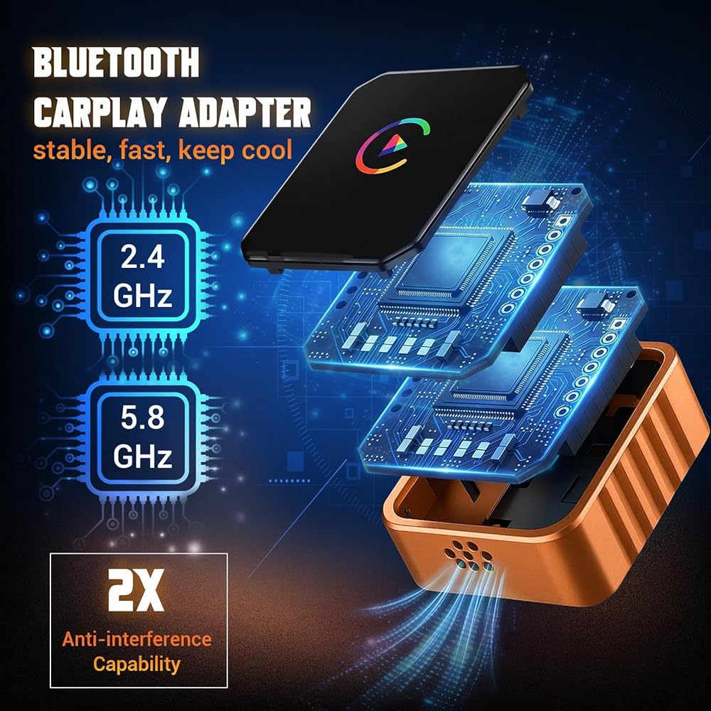 Superior Performance: The wireless carplay adapter for iphone features Bluetooth 5.0 (2.4GHz) for stable signal transmission, avoiding disconnection while driving. This screen mirroring adapter for car supporting 2.4-5.8GHz Wi-Fi, has double anti-interference ability. With aluminum alloy shell and heat dissipation holes for carplay wireless adapter reduces 50% heating, extending service life. Colorful lights paired with popular color schemes nowadays, adding fashion to the car interior.