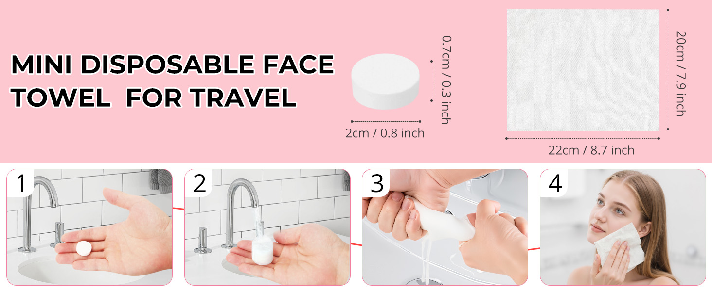 Easy to Use: Put it in cold or warm water for few seconds. It will be expansile and become a large soft towel, ampliative size: 8.7 x 7 inch (22 x 18 cm). Note: It looks like a candy or pill, inedible. Please do not be accessible to children.