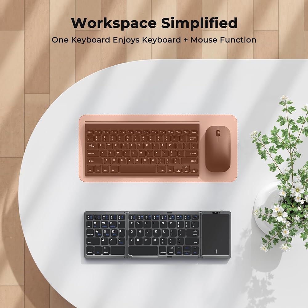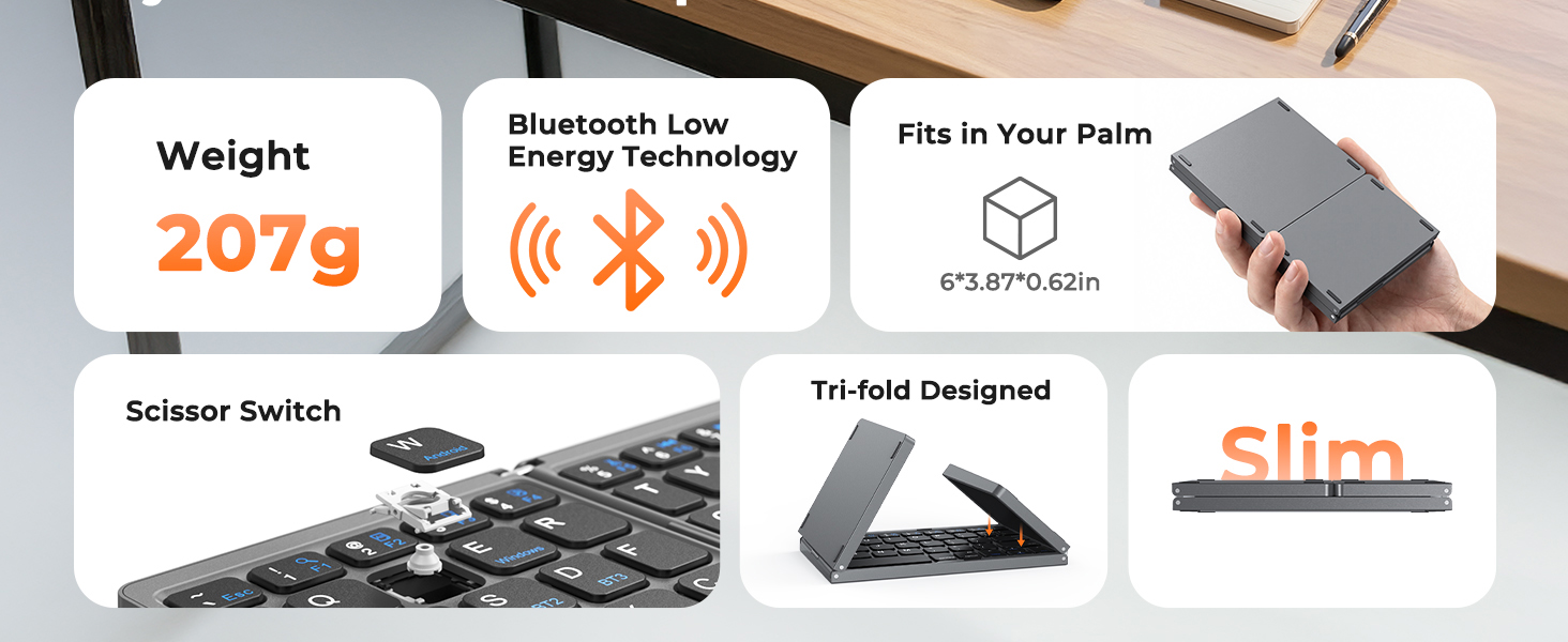 【Compact Palm-Sized Design】Folded size is only 6 x 3.87 x 0.63 inches (approx. 15.2 x 9.8 x 1.6 cm), palm-gripable, magnetic design ensures solid storage. Weighing only 209.4 grams (approx. 7.38 ounces), it can be easily stored in a briefcase or pocket to save space. It's a great companion for business trips, coffee shops, commuter flights or vacations (recommended for flat surfaces, folding hinges are not lockable).