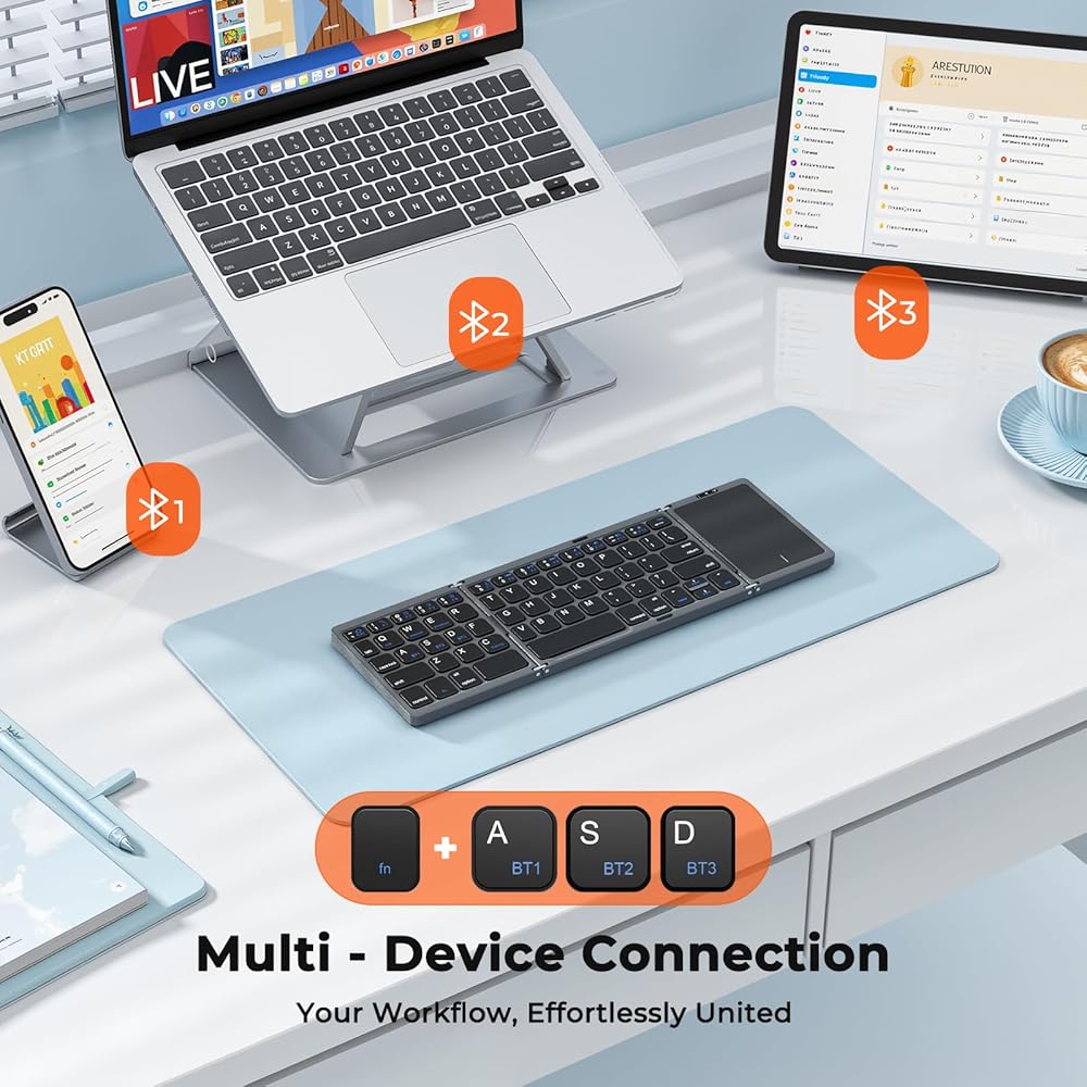 【3-Device Simultaneous Connection】Equipped with Bluetooth 5.1 triple-channel technology, it supports simultaneous connection of three devices (smartphones, tablets, and laptops) with zero-latency switching. It is not compatible with Mac OS system, and adapts to Windows, iOS and Android system, realizing smooth cross-device input, efficiently synchronizing file editing and message replying, and making multitasking easy and comfortable!