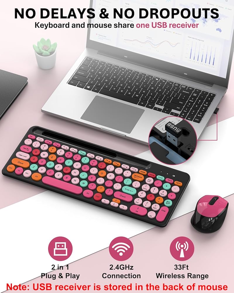 【Lag-free, Plug & Play】One 2.4GHz USB receiver can connect both the mouse and keyboard to your computer at the same time without any drivers and software, plug and play. Reliable wireless connection distance can reach 33feet without delay and disconnect, it can also keep your desk tidy without messy wires (𝐍𝐨𝐭𝐞: The retro keyboard and mouse 𝐬𝐡𝐚𝐫𝐞 𝐚 𝐔𝐒𝐁 𝐫𝐞𝐜𝐞𝐢𝐯𝐞𝐫, 𝐰𝐡𝐢𝐜𝐡 𝐢𝐬 𝐬𝐭𝐨𝐫𝐞𝐝 𝐢𝐧 𝐭𝐡𝐞 𝐜𝐚𝐫𝐝 𝐬𝐥𝐨𝐭 𝐨𝐧 𝐭𝐡𝐞 𝐛𝐚𝐜𝐤 𝐨𝐟 𝐭𝐡𝐞 𝐦𝐨𝐮𝐬𝐞)